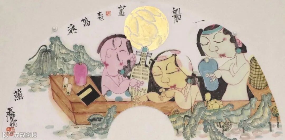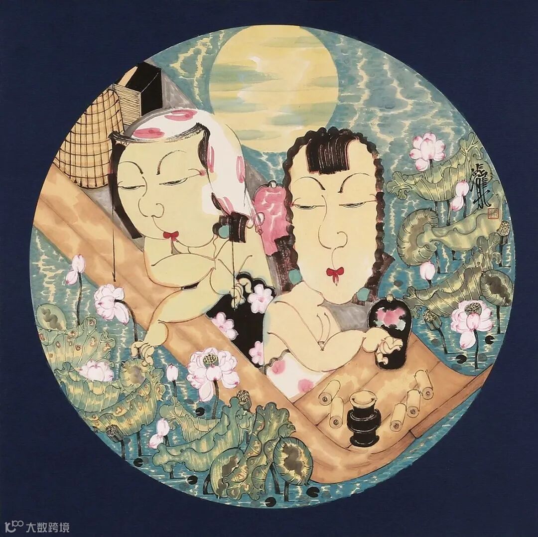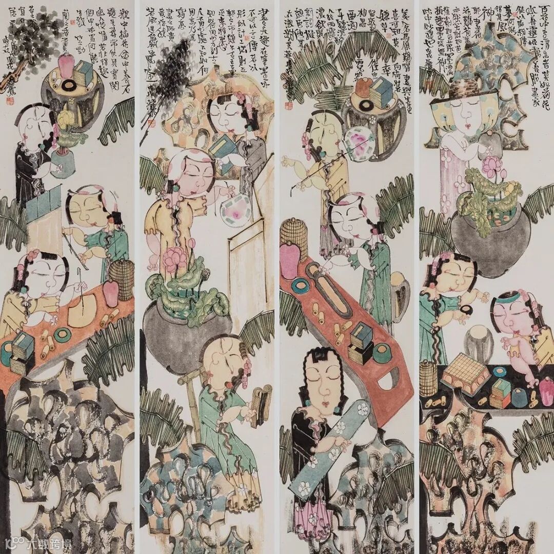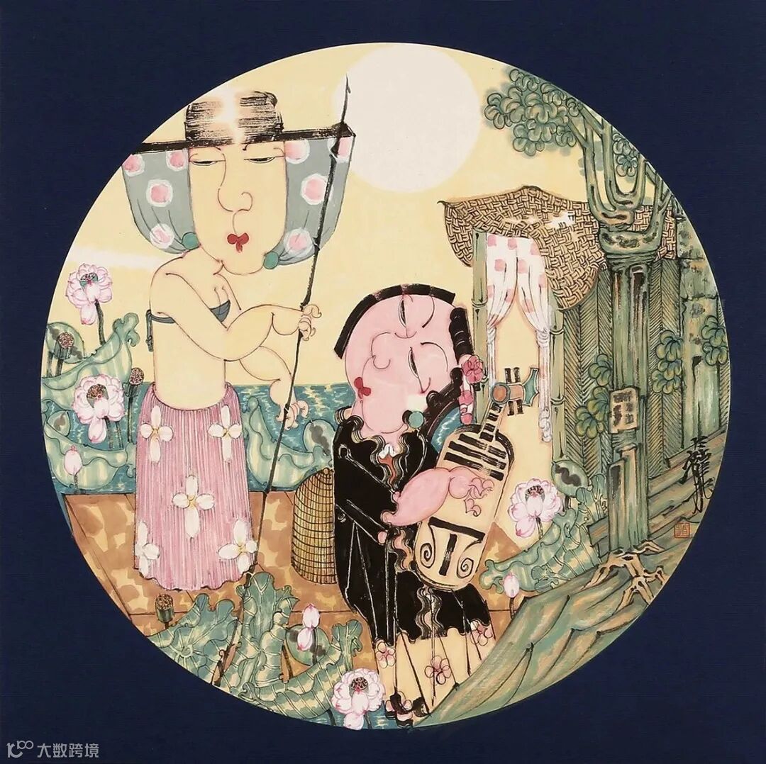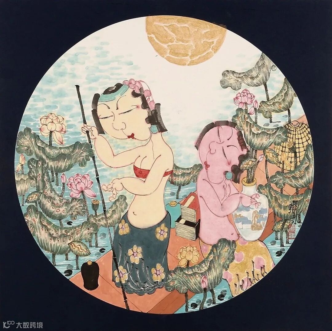 当然,还有其它画面构成要素可佐证,比如,古琴,古籍,字画,折扇,围棋,花瓶,屏风,荷花,芭蕉等等,在许多画幅上他还特意做了颇有古意的扇面处理。这些带有鲜明的女性符号、带有时代烙印和内涵指向的画面语言,透出浓浓古意的同时,也很直观地构架起女性叙事的外在话语体系。