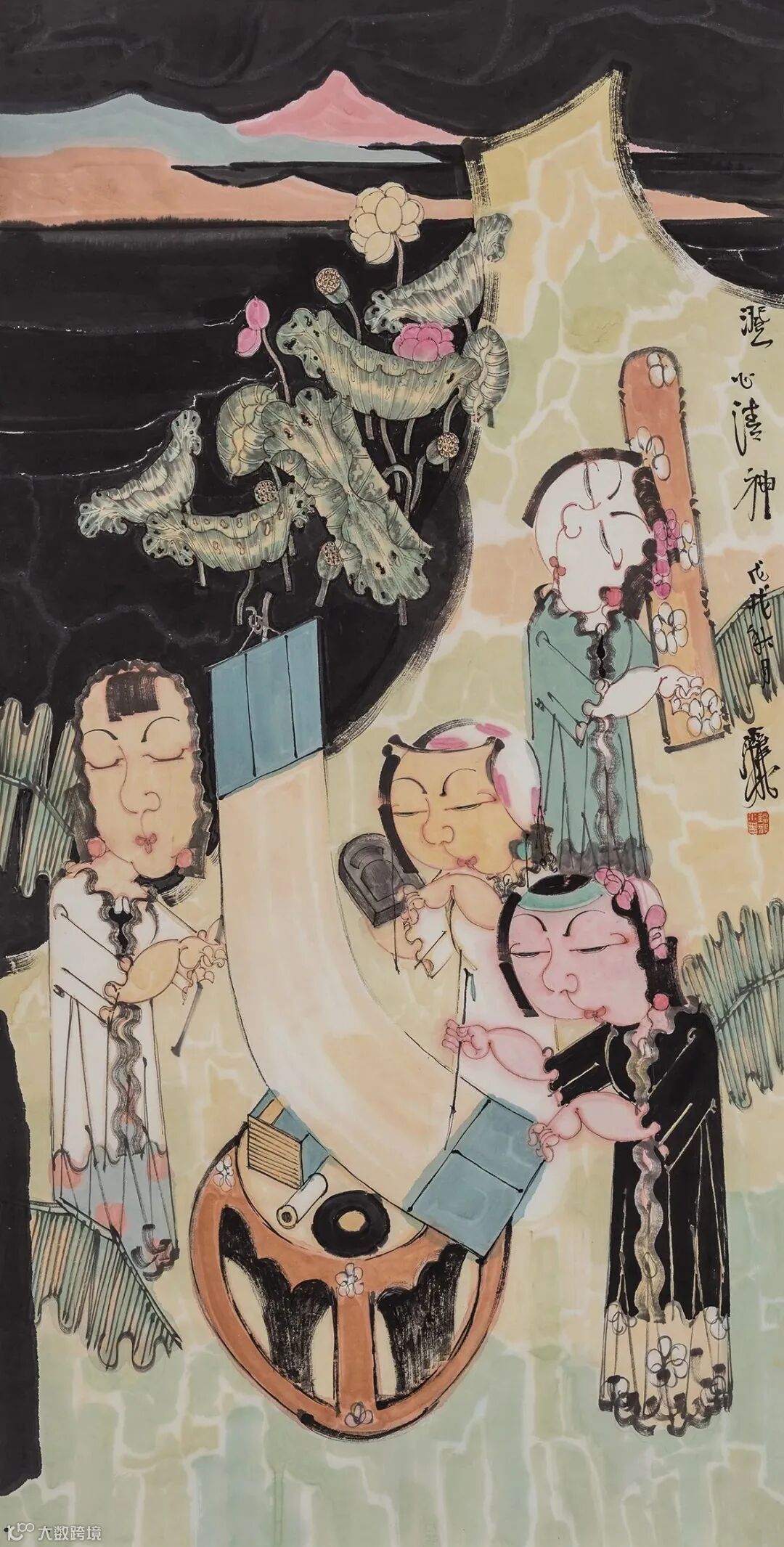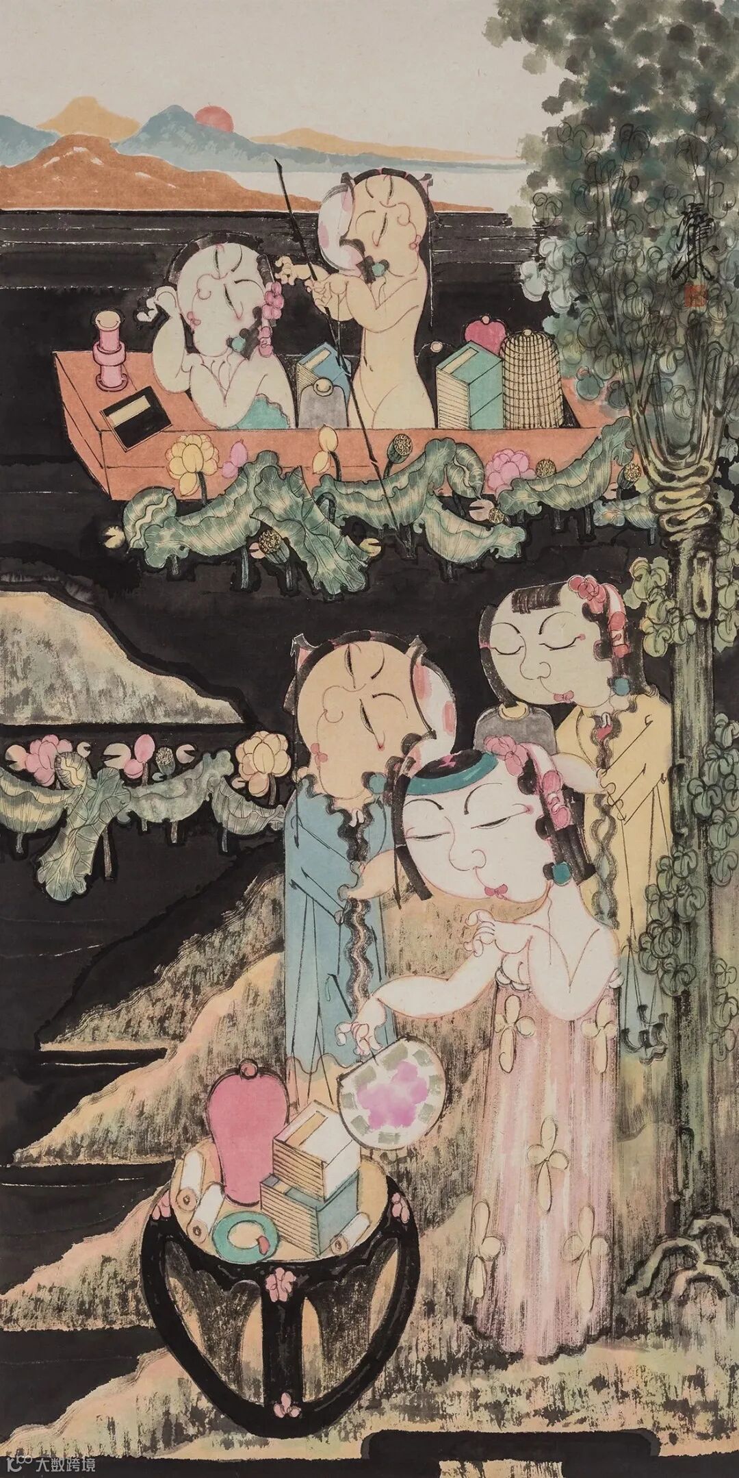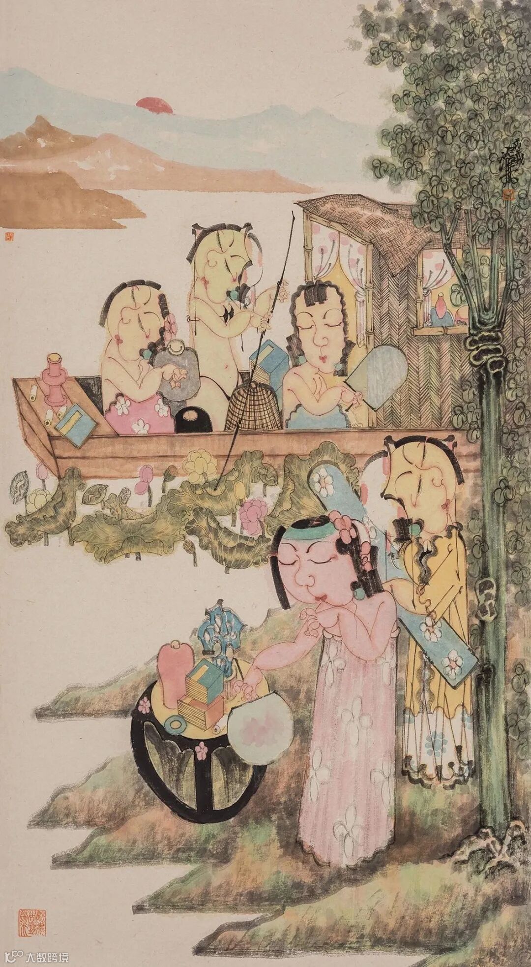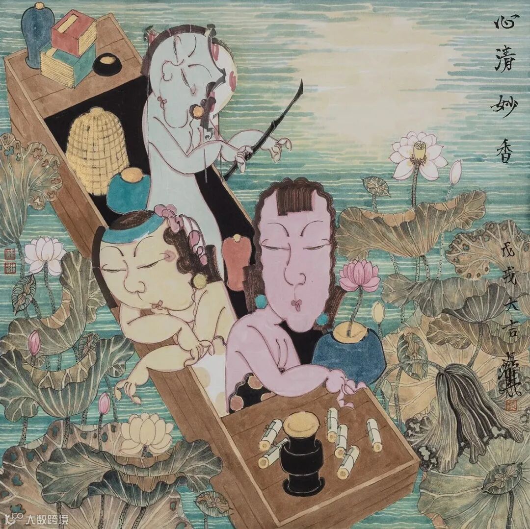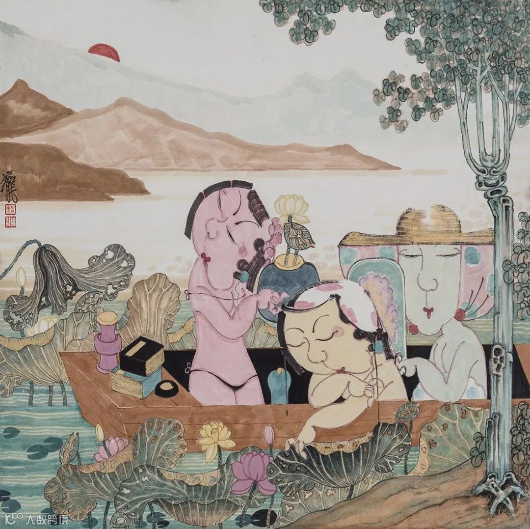 一幅画当然要讲一个故事,即便是静物,从线条、色彩之间也能显示出作者心态,或审美观。尤其是人物画更是如此,或取当下瞬间截面,或人物复杂纵横展开背景故事。赵锦龙的绝大多数画作的故事基本趋同,即:三五女性,或立于案几旁,绘画、抚琴、对弈、弹奏琵琶,嬉戏游艺;或乘一叶小舟,畅游于荷塘;或三五人塘边闲钓,塘内洗浴,等等。