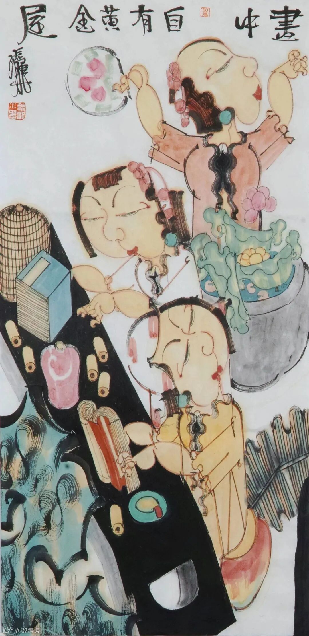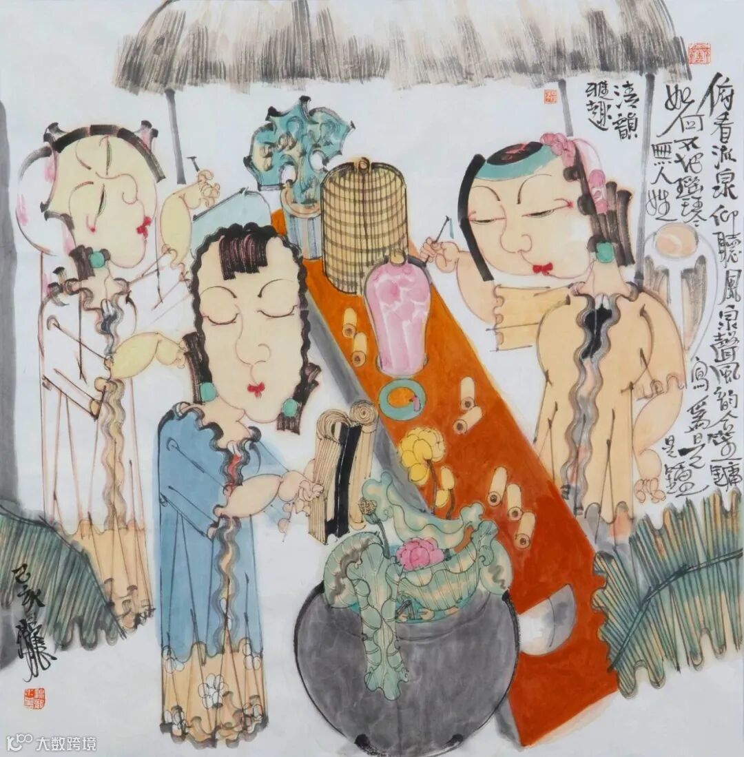 赵锦龙的画面取材构成,以女性为主体自然不必说,尽管人物适度夸张变形,但容貌、发型、衣饰,绝大多数还是来自传统,来自时空距离稍远的时代。这可以说是赵锦龙承袭传统、力求变革的符号性呈现,从而达到古今协商,趋向一致的理想审美状态。