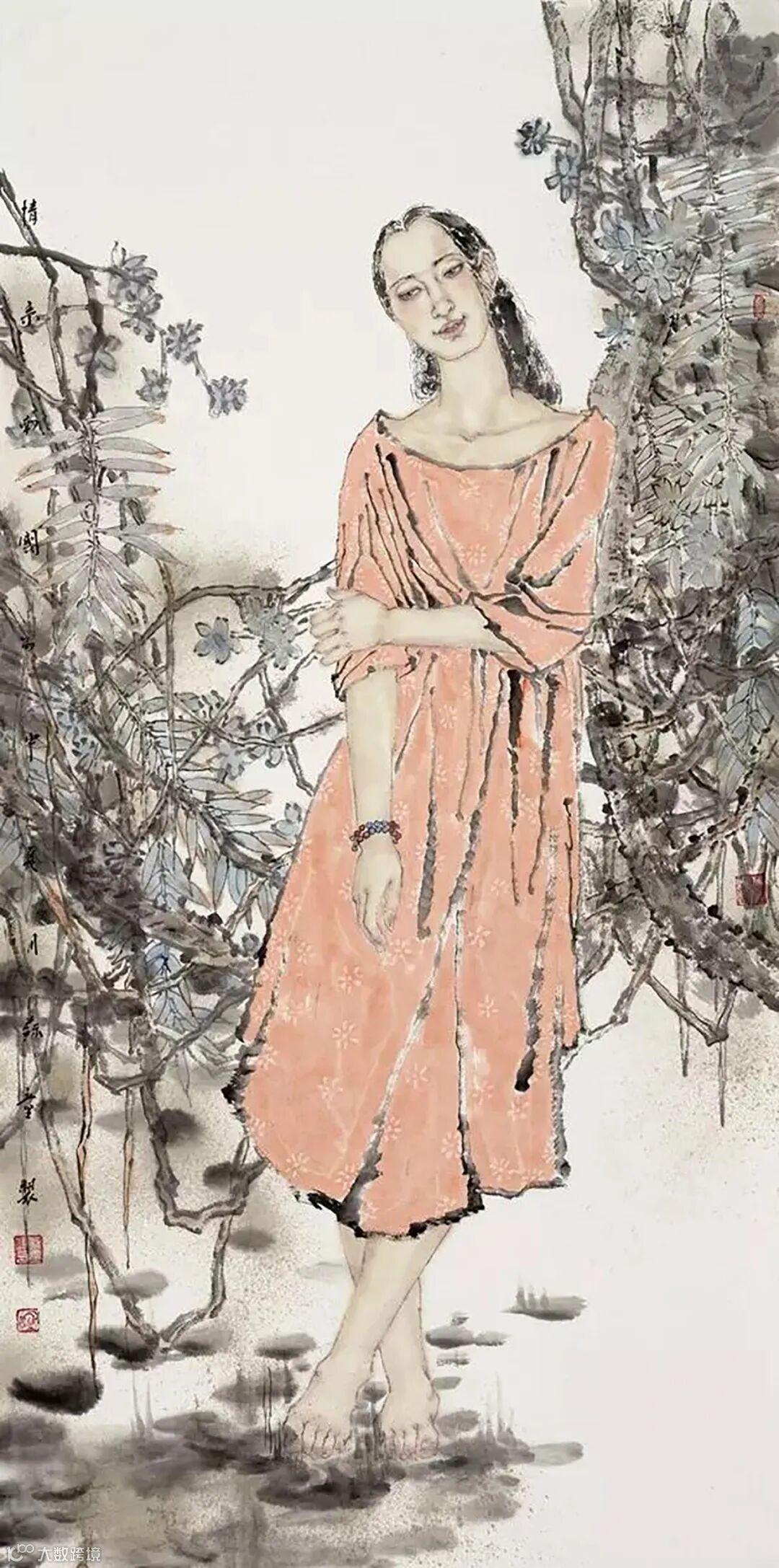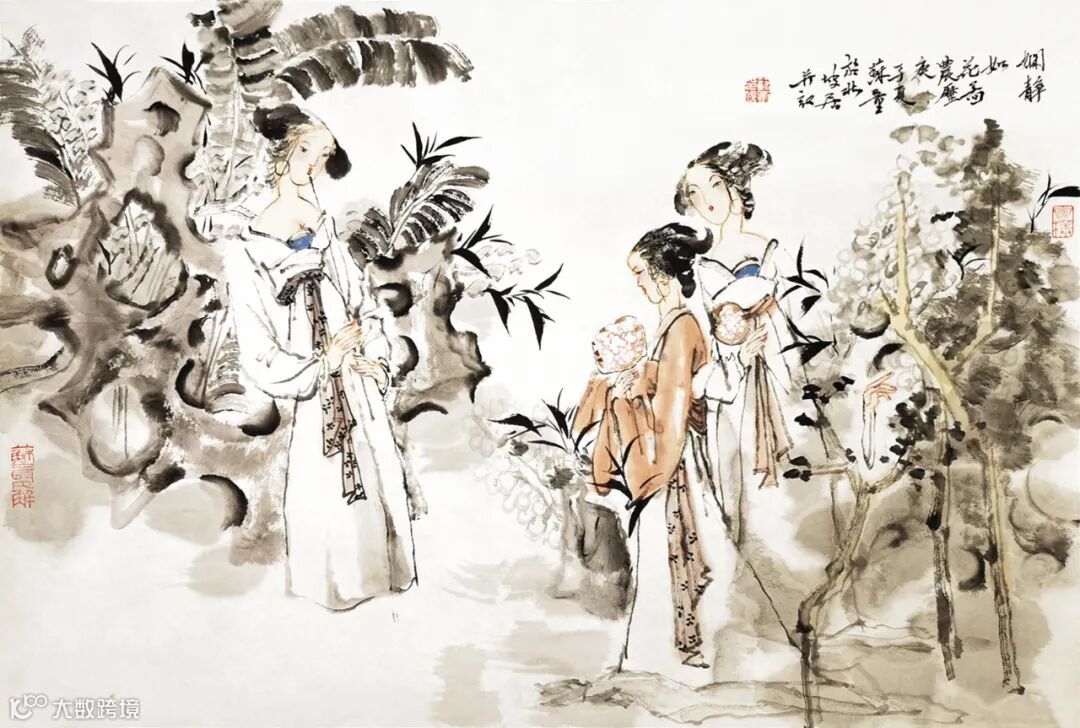 我的人物画造型准确、神韵生动,吸收了中国传统工笔画的优秀成分,并把西画的光影色彩巧妙地运用,产生了自然和谐的肌理效果,散发着浓郁的时代气息。书画应该是很潇洒的事情,特别是工笔画的创作。我耗时一年创作了一幅长五米多、宽二米的巨幅工笔,我不喜欢急功近利。大都市浓厚的文化气息和美术大师的优秀作品,促使着我不断提升自己的绘画水平、完善着自己的精神世界。