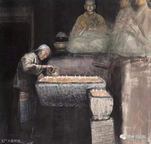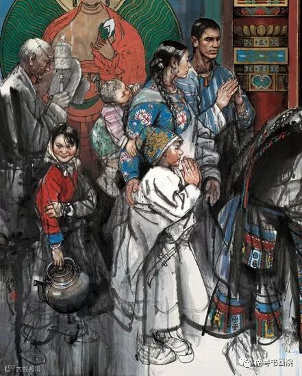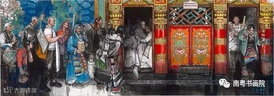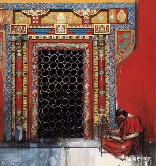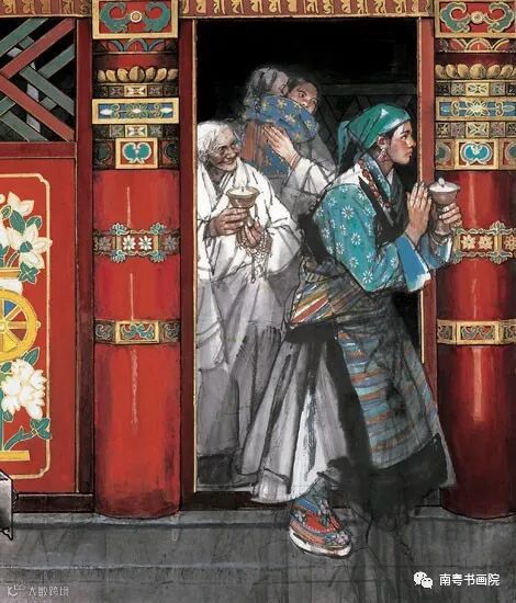 早课的第一堂是朝山,从山脚开始,念一句佛号,趴在地上叩一个头起来,向山上迈一步;再念一句佛号,再叩一个头,再起来……一直叩到山顶,即使赶上下雨地上全湿的时候也要叩下去。炎热的夏季,戒子们仍然要按规矩穿好六层僧衣,即使不下雨,浑身上下从里到外也会被汗水浸透。在西藏,史国良看过也画过一队队男男女女的藏民背着行囊摇着转铃,走一步叩一个长头,直叩到佛住的地方。