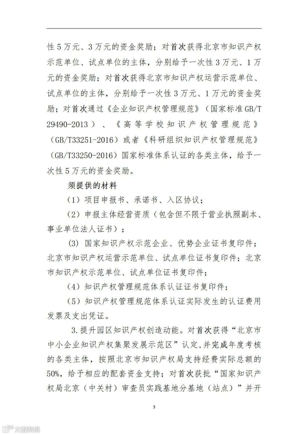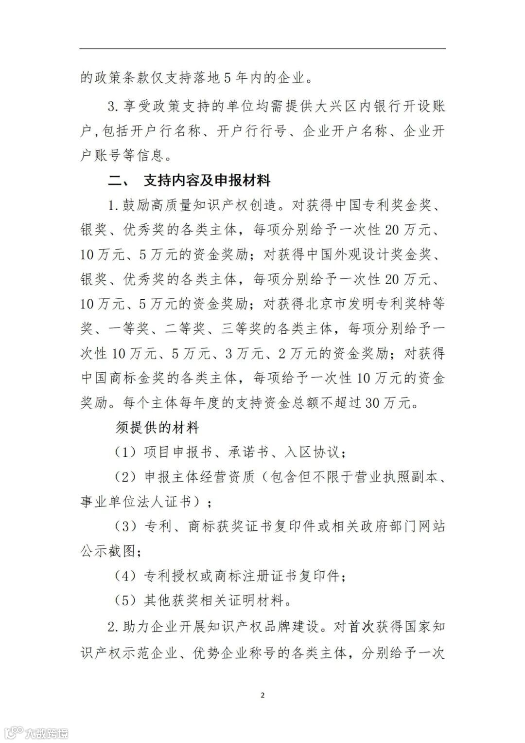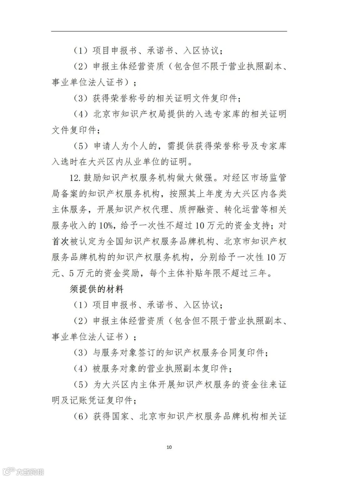 具体申报条件及材料详见《大兴区促进知识产权发展暂行办法申报说明》(附件2)。