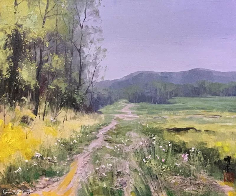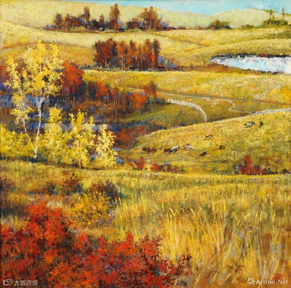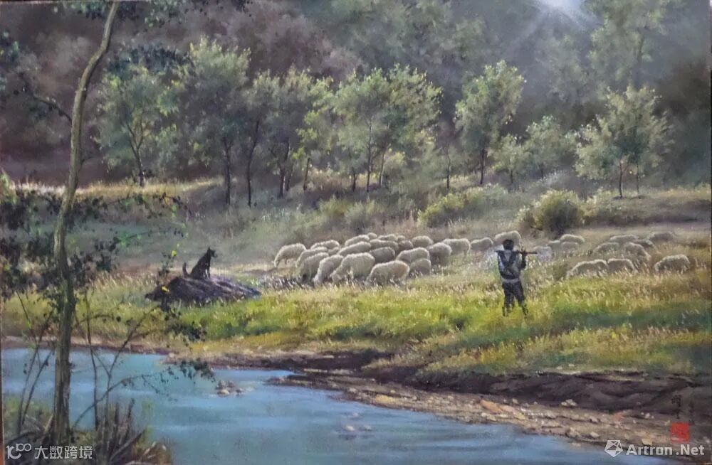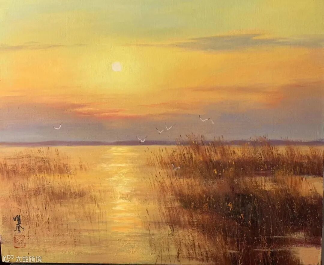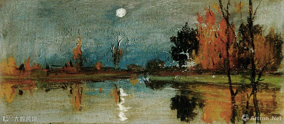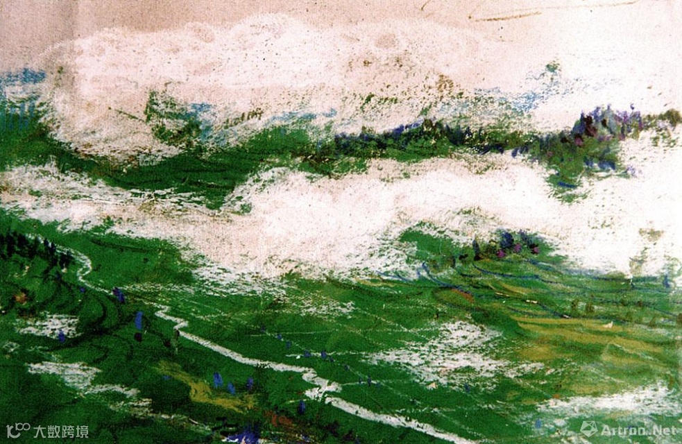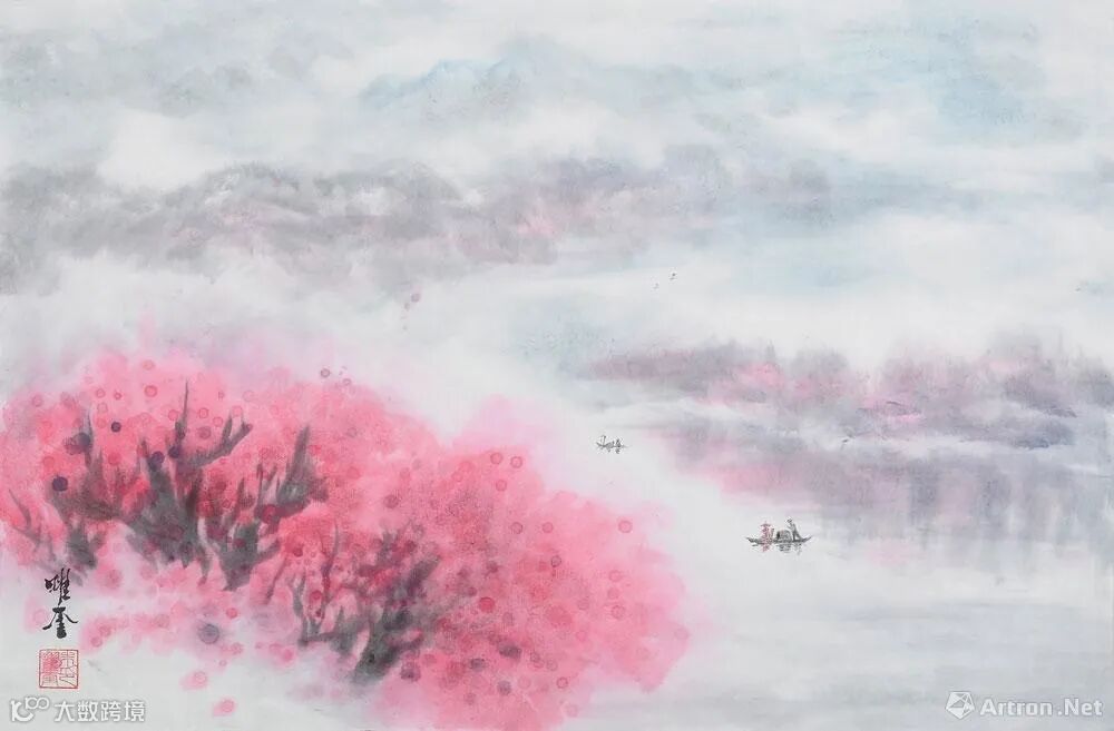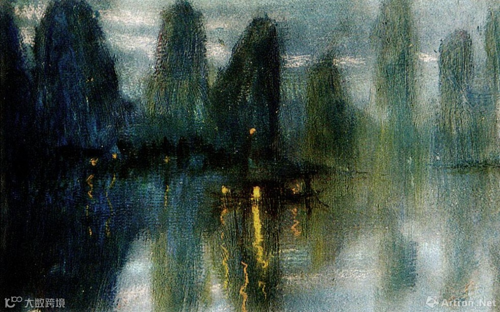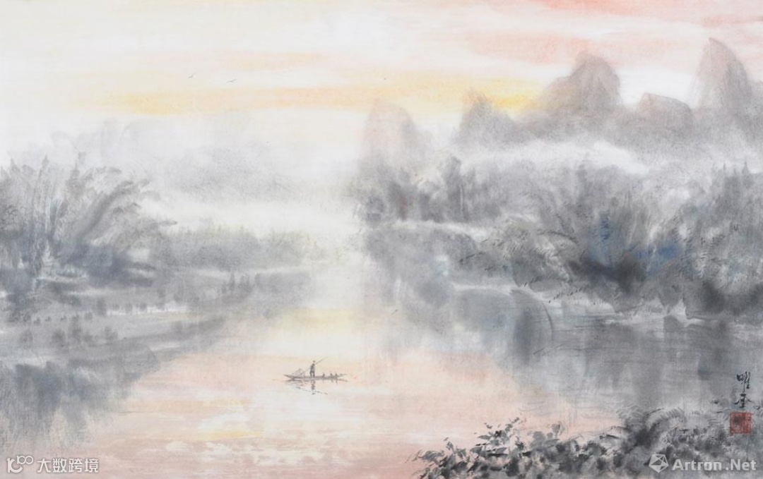 作品的生命张力与丰富色彩变幻,产生了异乎寻常的视觉效果。画中远山,在阳光照射下,紫云萦绕,雾霭茫茫,江水清澈,倒影实景难分姿色,渔者悠然,远离尘喧的世俗。