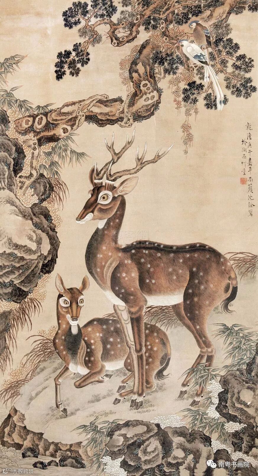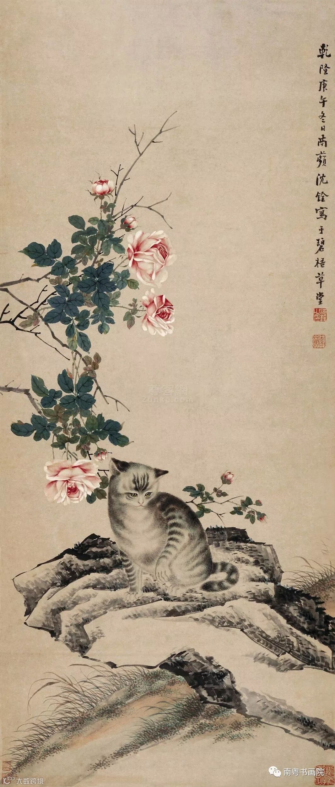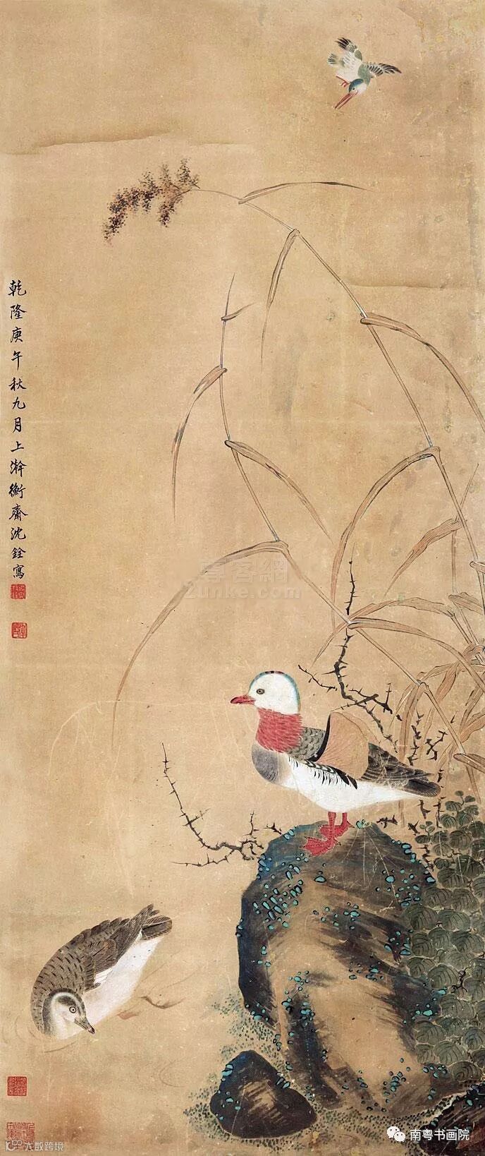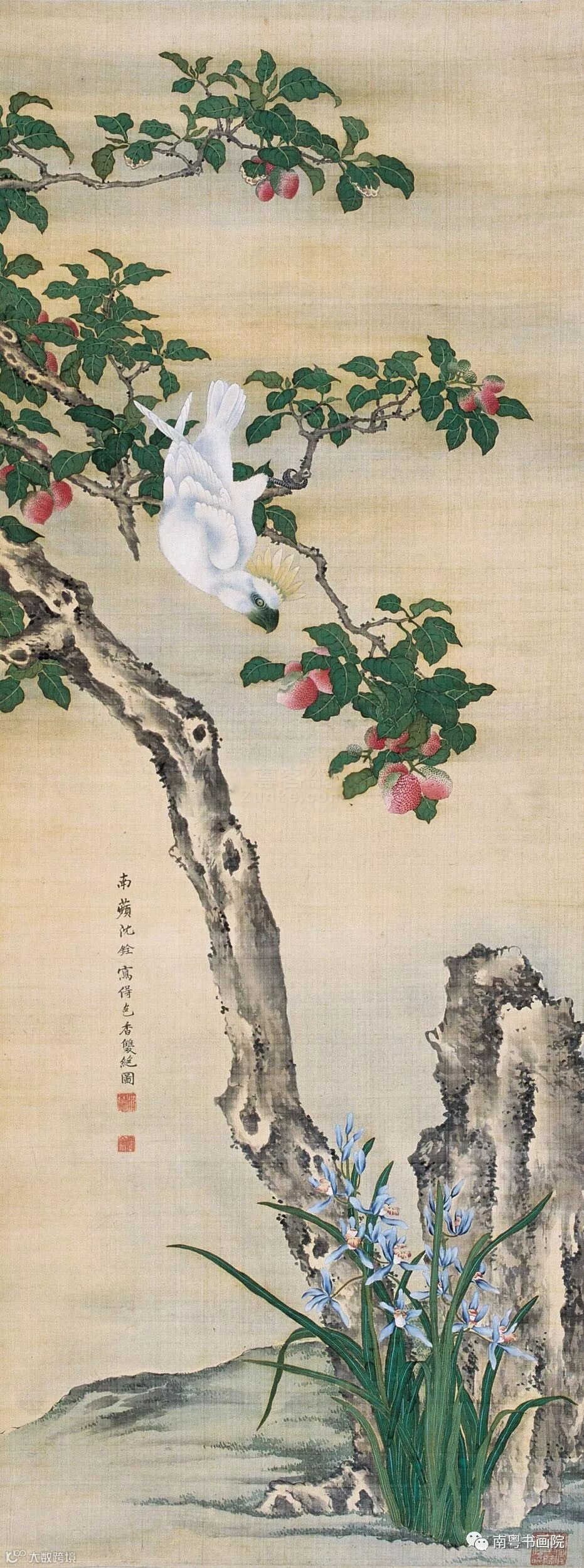 沈铨(1682—1760)字衡之,号南苹,浙江湖州(一作吴兴)人。工写花卉翎毛、走兽,以精密妍丽见长,也擅长画仕女。创“南苹派”写生画。曾受聘东渡日本,留三年始归,深受日人推崇,被称为“舶来画家第一”。