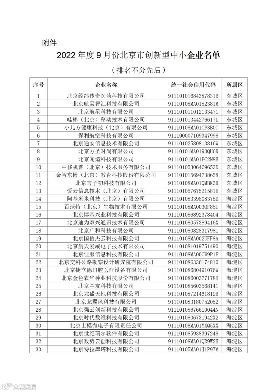 北京市经济和信息化局 关于对2022年度9月份北京市创新型中小企业名单进行公告的通知