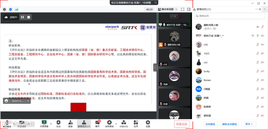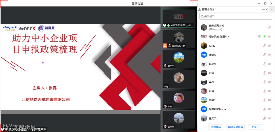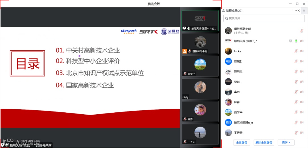 培训以线上腾讯会议直播的形式举行,由顺然天成的张磊老师担任培训讲师。培训内容主要包含中关村高新技术企业、科技型中小企业评价、北京市知识产权试点示范单位、国家高新技术企业等方面的政策解读和梳理。