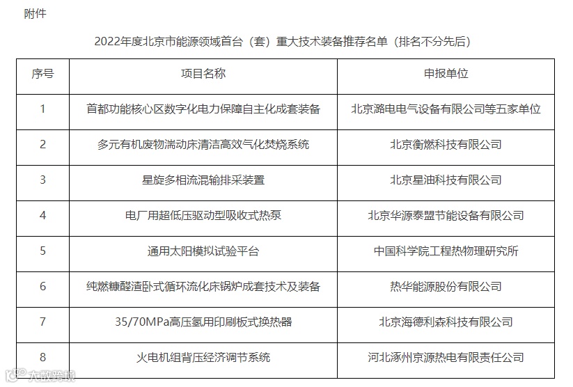 关于公示2022年度北京市能源领域首台(套)重大技术装备推荐名单的通知