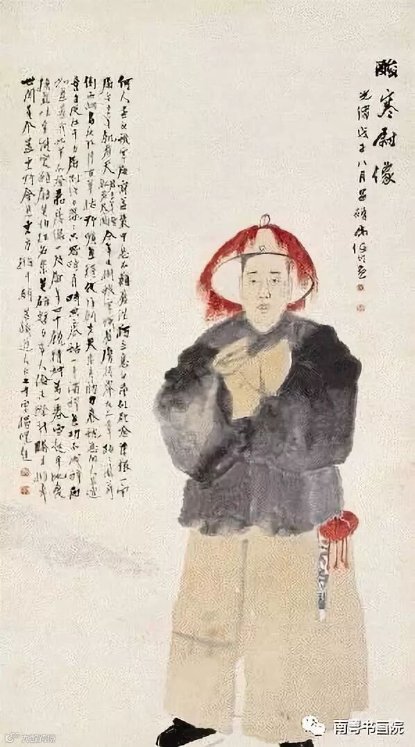 任伯年曾多次为吴昌硕画像,形态各不相同,而此件最为精彩。吴昌硕早期在上海任一小官,时值盛夏,日中归来,疲乏至极,又不得不强打精神。任伯年见之,触动画思,当即为之写照。画中吴昌硕穿全套官服立于赤日炎炎之下,马蹄袖交拱胸前,凝视端正,意态矜持而又酸楚,其状可哂。淡笔草草勾写面部,略加皴擦。马褂、长袍直接用色墨即兴随手写来,巧妙地把花卉没骨法融会于立意构思之中,浓淡得宜,色中见笔,气势非凡,别开生面。通幅一气呵成。