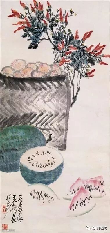 王个簃1897年10月生于江苏海门一个教师家庭。自幼攻诗经、练书法和篆刻,在南通省立第七中学毕业后当了一名教师。1919年在南通城北小学任教时结识了吴昌硕的门生李苦李。1920年结识了吴昌硕的大弟子陈师曾。次年结识了吴昌硕的挚友诸宗元,由诸宗元把王个簃早年所刻印稿四大本,带给吴昌硕批注点评。1923年8月在李苦李的引荐下王个簃见到了吴昌硕。当年王个簃27岁,毅然辞去南通省立第七中学国文教师的工作,赴沪拜入吴门,并应邀兼任吴昌硕孙子吴长邺的家庭启蒙教师,从此有机会日夜陪伴在吴昌硕身边。在吴昌硕晚年的日子里,王个簃朝夕侍师,聆听教诲,勤学苦练,诗书画印衣钵尽传。文艺界普遍认为吴昌硕有三高足:第一陈师曾、第二潘天寿、第三王个簃。他们的艺术成就都为中国书法篆刻艺术的繁荣和发展作出了杰出的贡献。