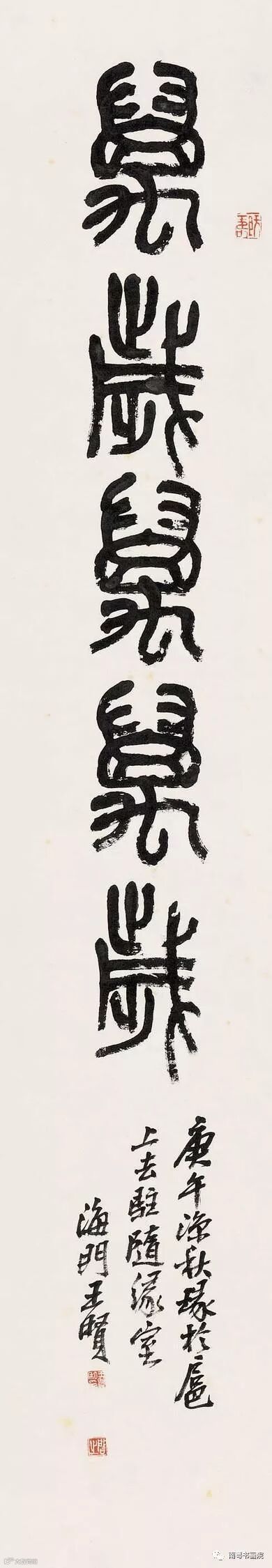 我从事篆刻六十年来,坚持书写石鼓,参以琅琊台石刻、古籀文意,并其他金石文字,旁及行、隶,未敢或辍,以求得用笔熟中生、拙中奇,凝炼浑朴,气势厚重。我以为刻印要从汉印入手。在印面方寸之间,铺陈排列、章法经营,要从容自然,奏刀要注重气势,能入能出,平正中见险劲,波磔中求自然,不以怪诞霸气取胜,不以娇妍媚俗。这是我毕生所追求的目标。半个多世纪过去了,我八十三岁那年所刻“献身四化”等四巨印,力求达到铺陈空阔、流畅自然的境界,而力有未逮,为可憾耳。门人刘伯年谓我此作大气磅礴,可谓传世之作,未免过誉。