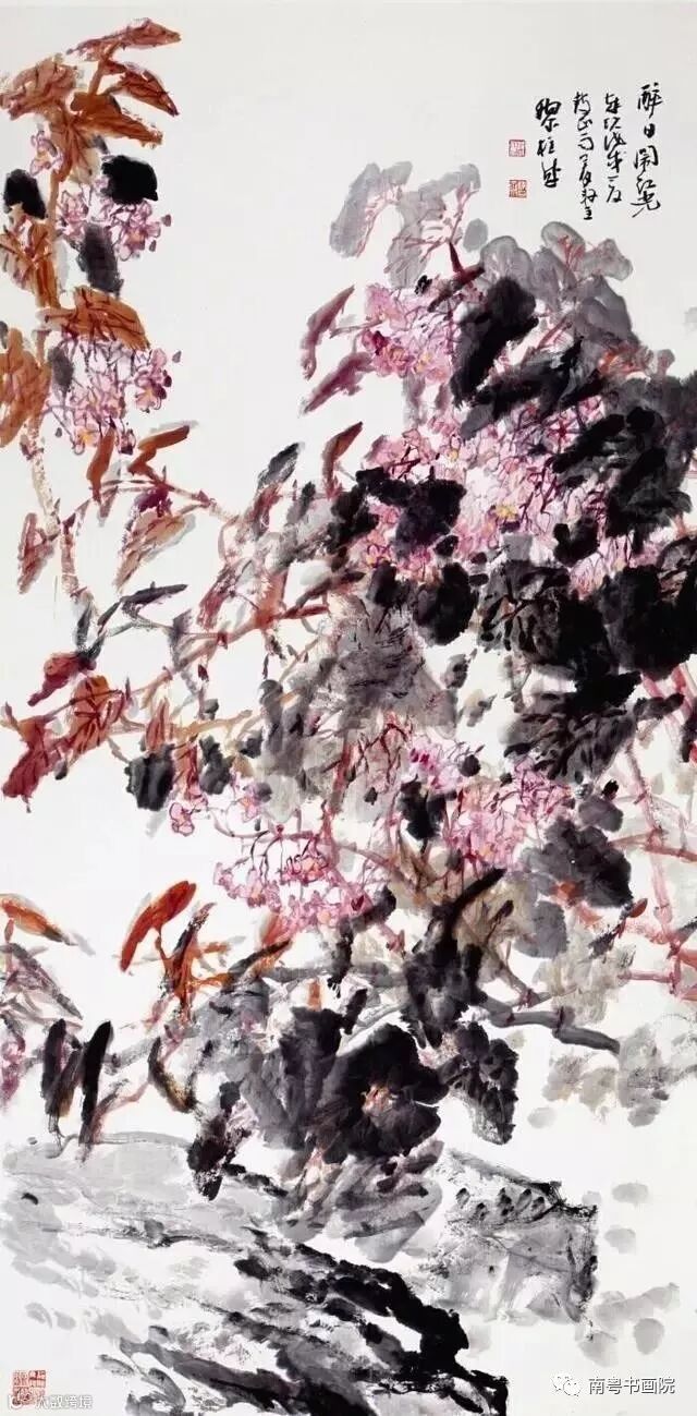 这是中国画千百年来积淀下来的重要传统,黎柱成深知只有自我与自然直觉认同为一种本质特征时,自已的内心意象才能同花鸟树木的生命律动与精神活力获得一致,作品中才能充滿生机与生命律动。因为,绘画的目的并不在于有形地反映可见之物,而在于对于“不似之似”的敏感与认知,持实成虚,使一切郁勃之气与生机荡漾于笔墨、色彩之间。