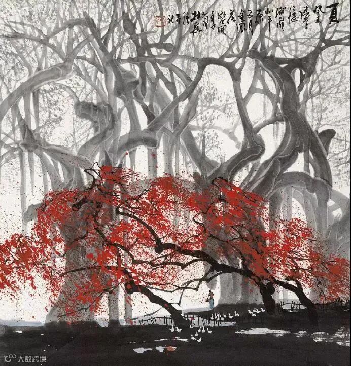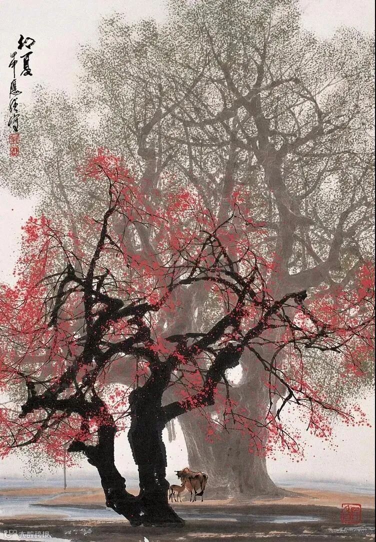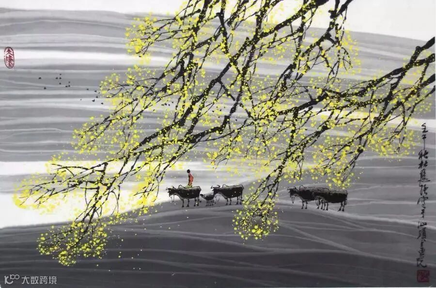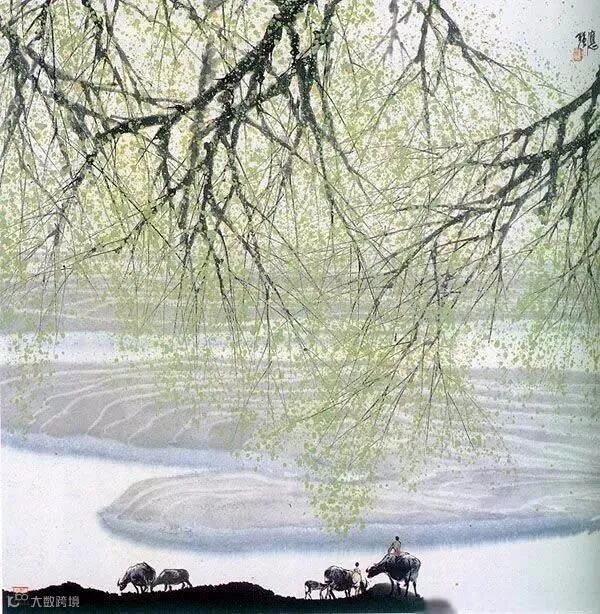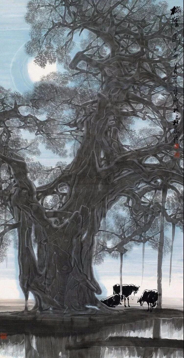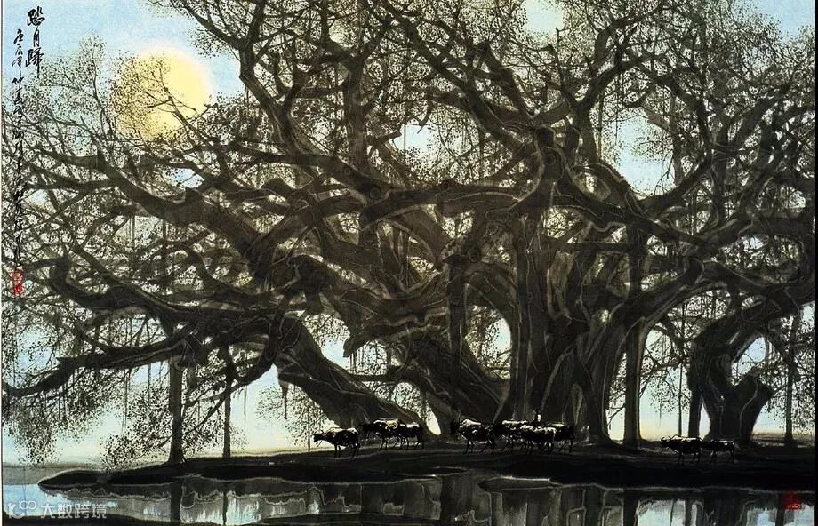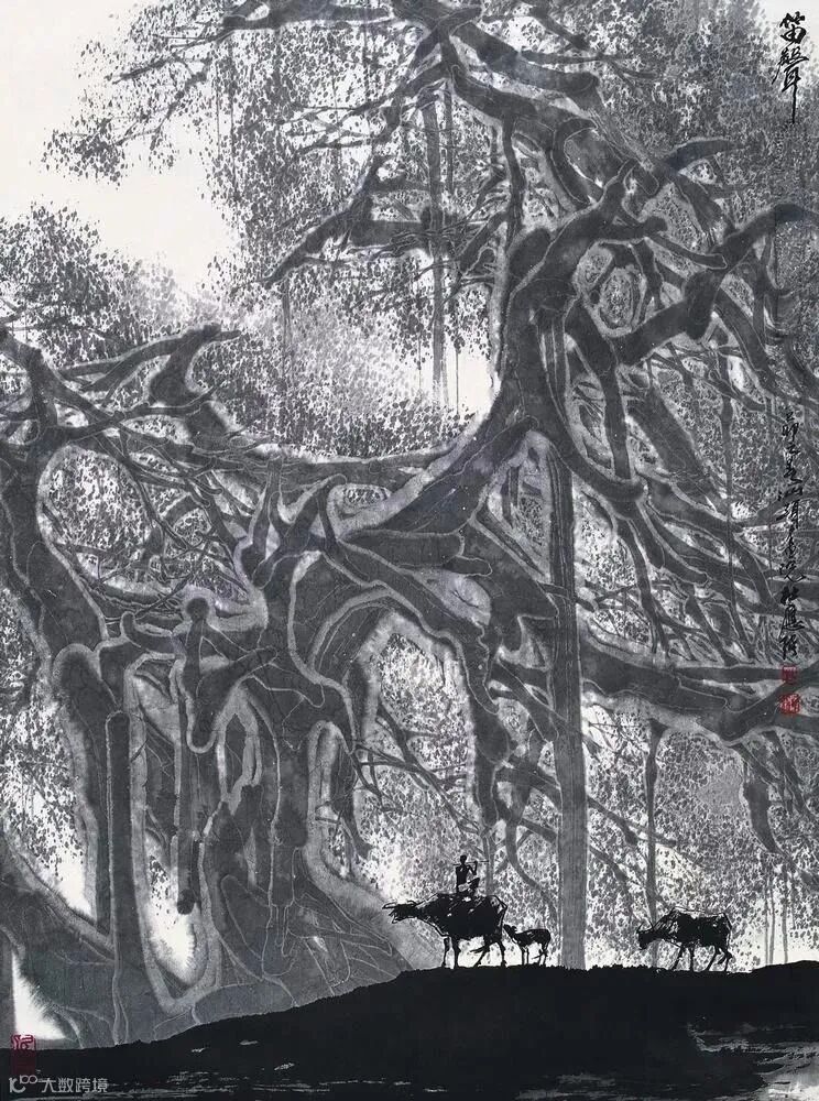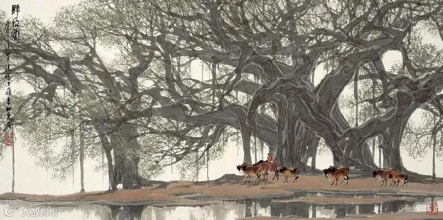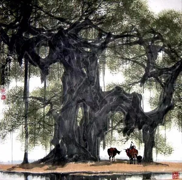 与榕树形成对比的多是边线轮廓较为清晰、墨色较浓和黑白对比较为强烈的水牛(有时还有骑在牛背上的农人),或者是由较浓墨色画成的地面。画面敷以淡彩,墨与色融为一体,在统一气氛中有变化、有灵动。