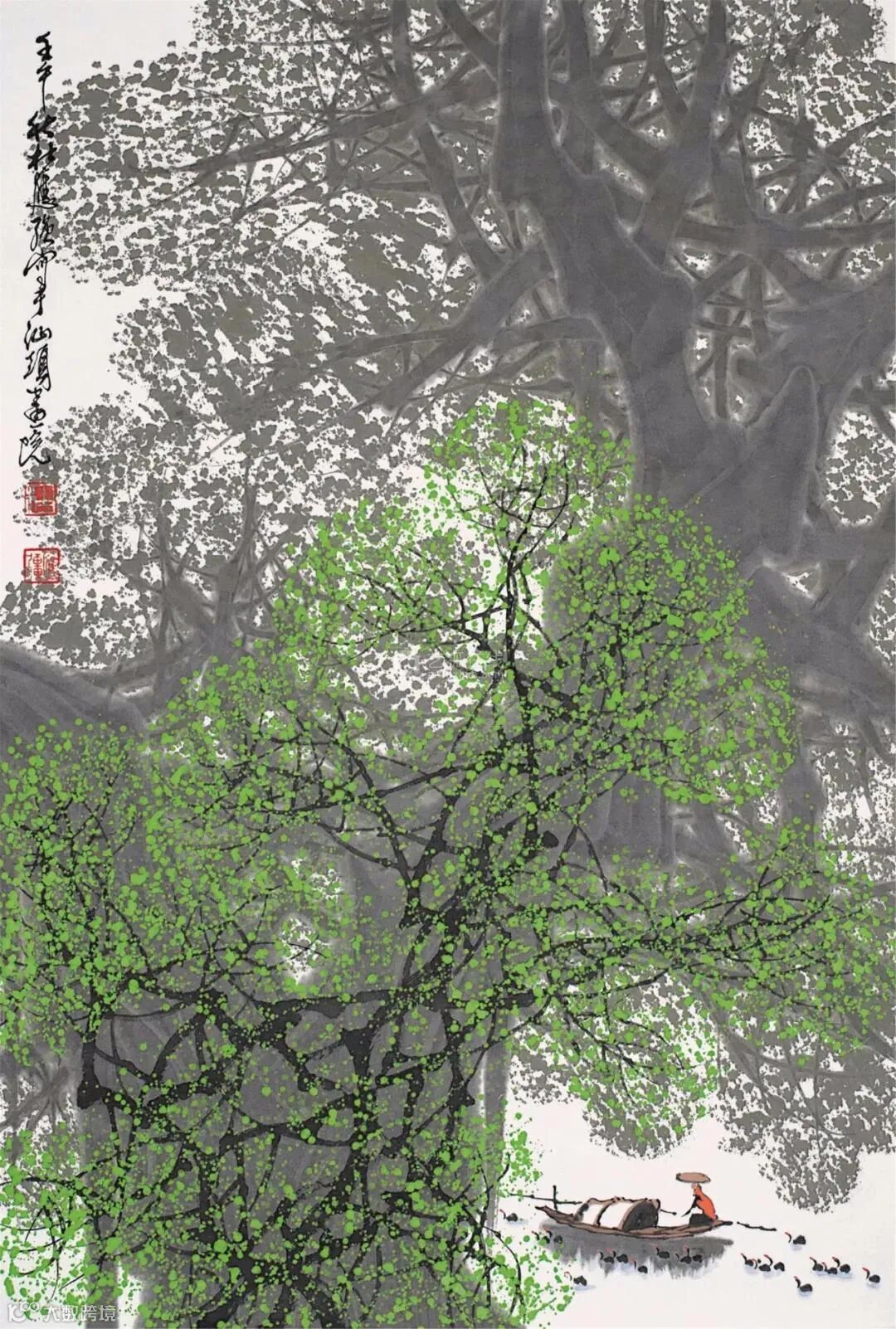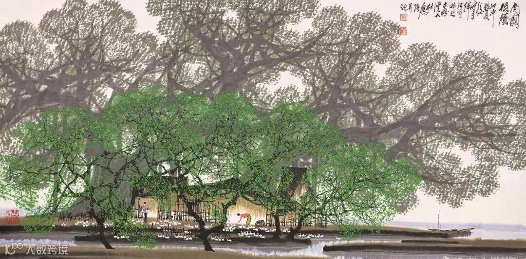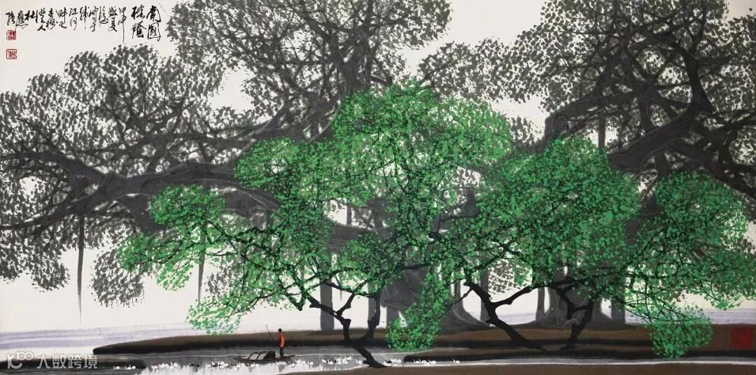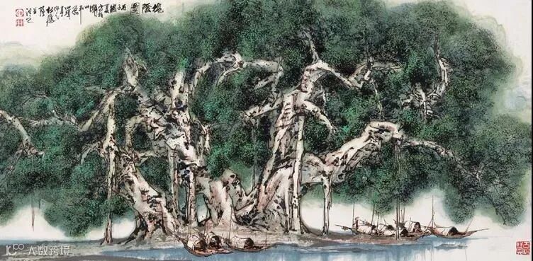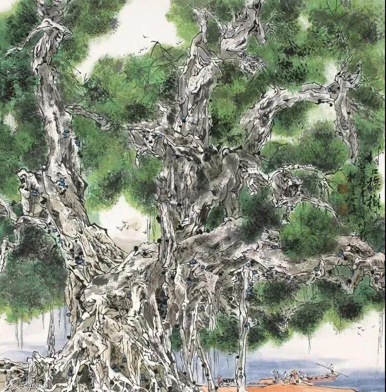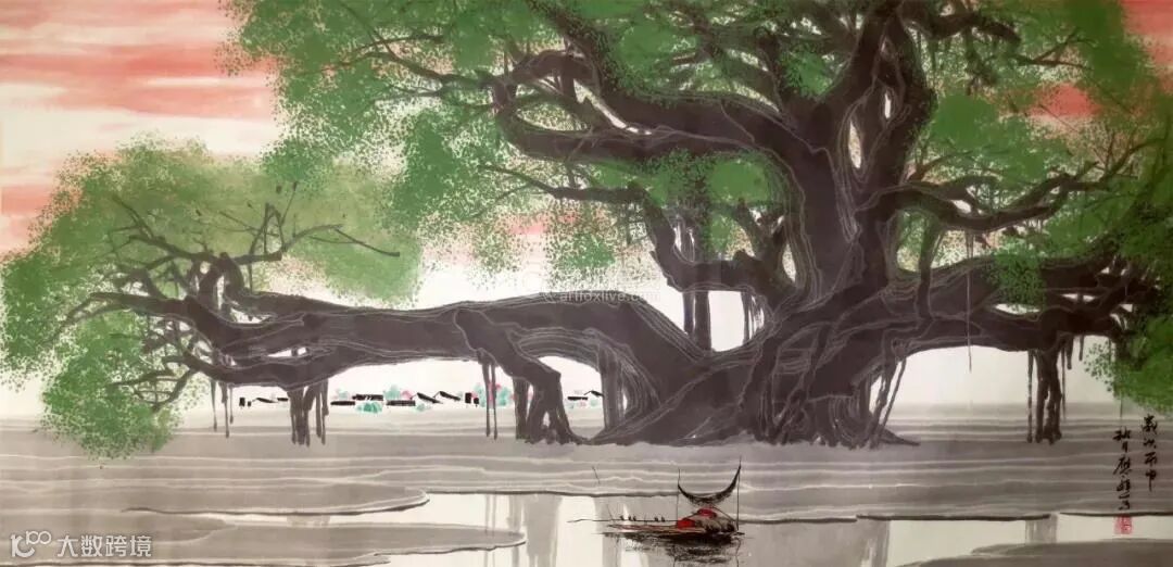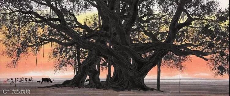 画面上盘根错节、枝叶繁茂的榕树占主体位置,榕树枝干体面之间的边线由淡墨映现出来,墨色在柔和的调子中有微妙变化。