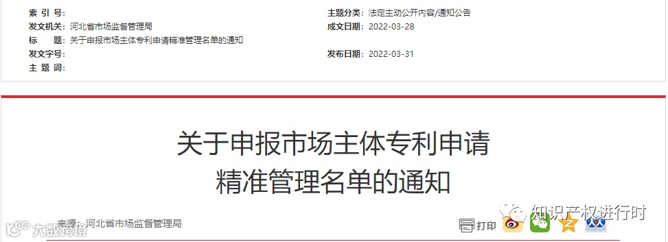 各市(含定州、辛集市)市场监督管理局,雄安新区综合执法局,省局机关有关处室、省知识产权保护中心:为维护专利申请市场秩序,打击非正常专利申请行为,保护市场主体的合法权益,推动知识产权事业高质量发展,根据国家知识产权局《关于持续严格规范专利申请行为的通知》(国知发保字〔2022〕7号)要求,决定实施市场主体专利申请精准管理,在全省开展专利申请精准管理名单申报工作。现就有关事项通知如下:
