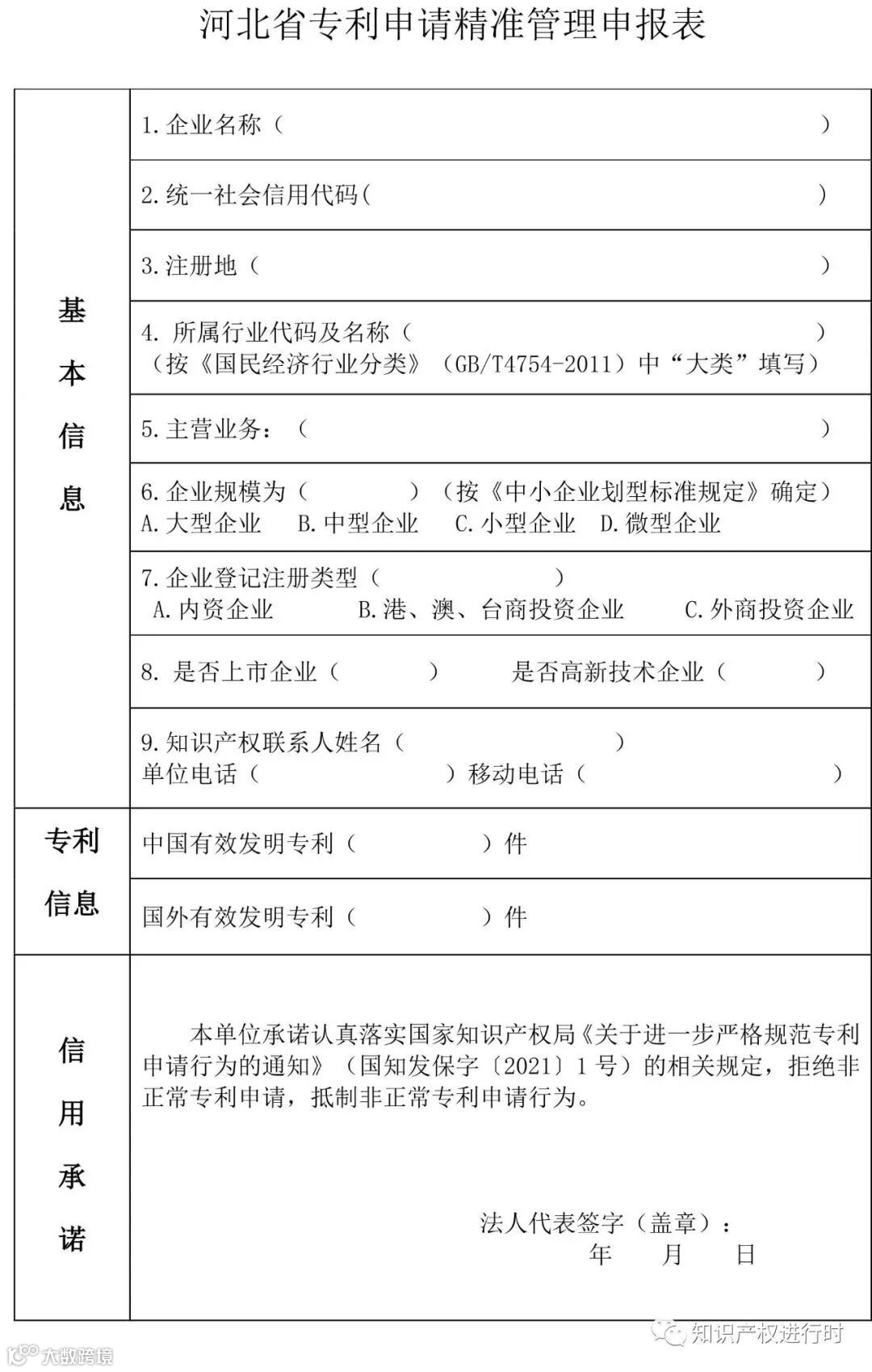 三、申报程序(一)各地市场监督管理部门负责组织、动员本区域内市场主体申报,按申报条件审核后拟定本地市场主体精准管理推荐名单。(二)市场主体自愿申报,按照要求填写《河北省专利申请精准管理申报表》,并提供营业执照、事业法人证书或统一社会信用代码证书复印件备查。(三)省局根据各地上报的推荐名单及申报表进行核实,审核后报国家知识产权局备案公示。(四)精准管理名单原则上不限额,每年申报、审核并公示一次,具体要求以省局印发通知文件为准。
