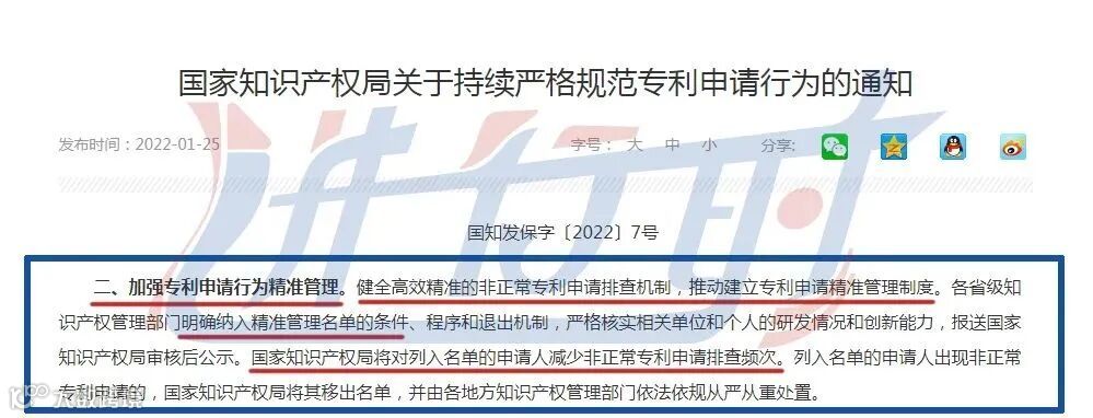 2022年1月25日,国家知识产权局印发《关于持续严格规范专利申请行为的通知》,其中提到:各省明确纳入精准管理名单的条件、程序和退出机制,严格核实相关单位和个人的研发情况和创新能力,报送国家知识产权局审核后公示。国家知识产权局将对列入名单的申请人减少非正常专利申请排查频次。《关于持续严格规范专利申请行为的通知》