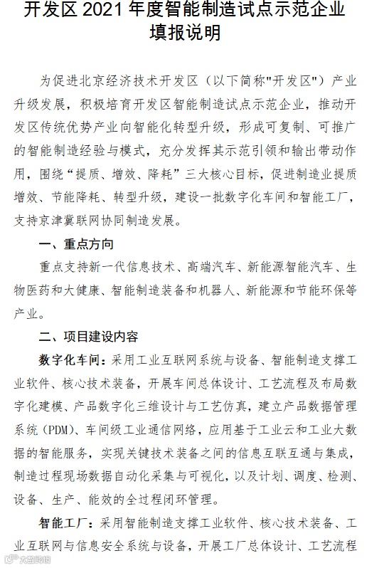 为促进北京经济技术开发区(以下简称"开发区")产业升级发展,积极培育开发区智能制造试点示范企业,推动开发区传统优势产业向智能化转型升级,形成可复制、可推广的智能制造经验与模式,充分发挥其示范引领和输出带动作用,我局现组织开展开发区2021年度智能制造试点示范企业申报工作,请区内企业结合实际,报送相关材料,现将有关事项通知如下: