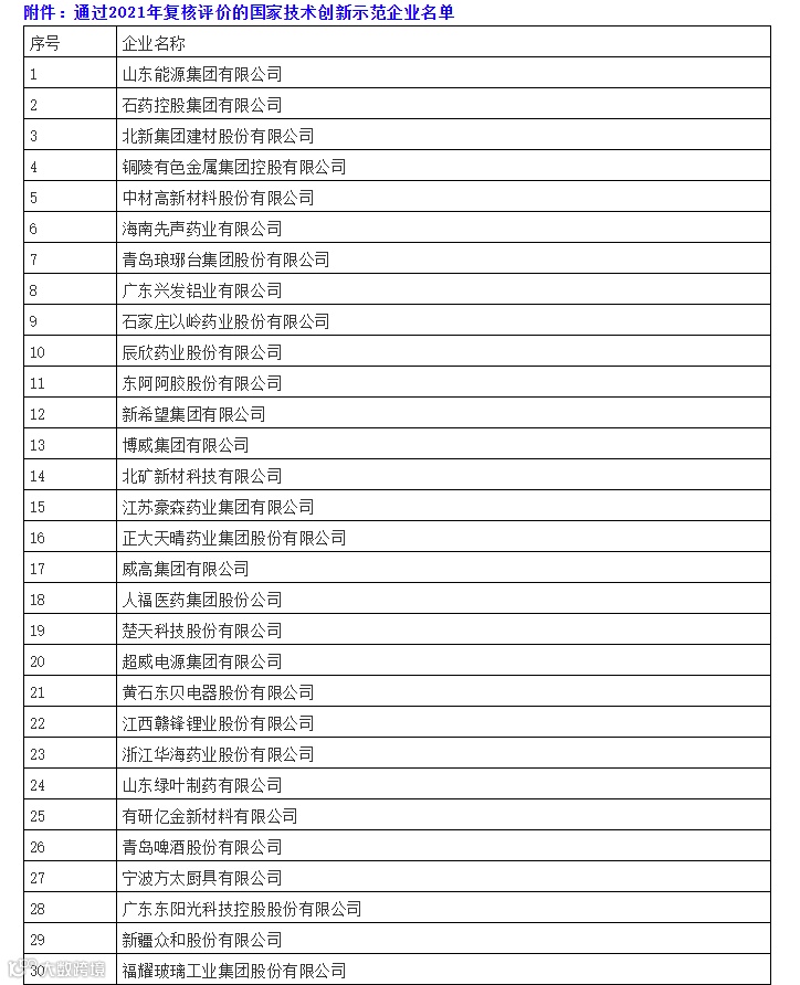 山东能源集团有限公司等207家企业通过复核评价。北大方正集团有限公司、南京高精传动设备制造集团有限公司、江苏豪迈照明科技有限公司、冠福控股股份有限公司、山东泉林纸业有限责任公司、上海置信电气股份有限公司等6家企业未通过复核评价,撤消其国家技术创新示范企业称号。因企业合并重组,保留中国建材集团有限公司相关子公司的国家技术创新示范企业称号,不再保留中国建材集团有限公司的国家技术创新示范企业称号。