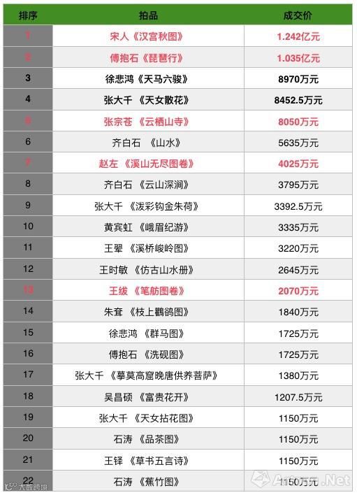 北京保利2018年春拍中国书画超级夜场成交高价榜
