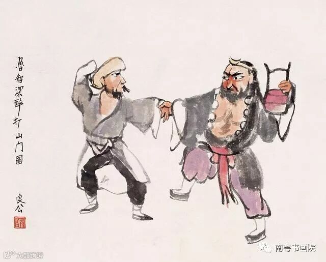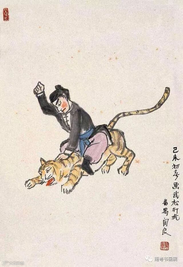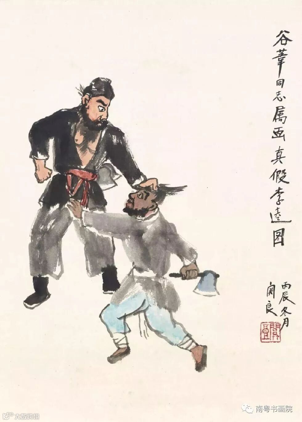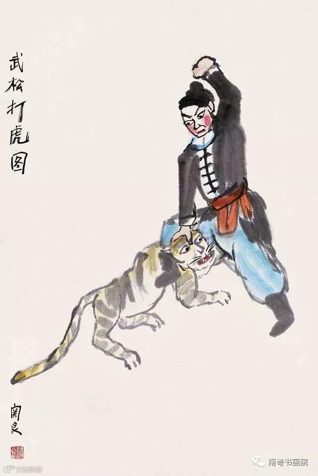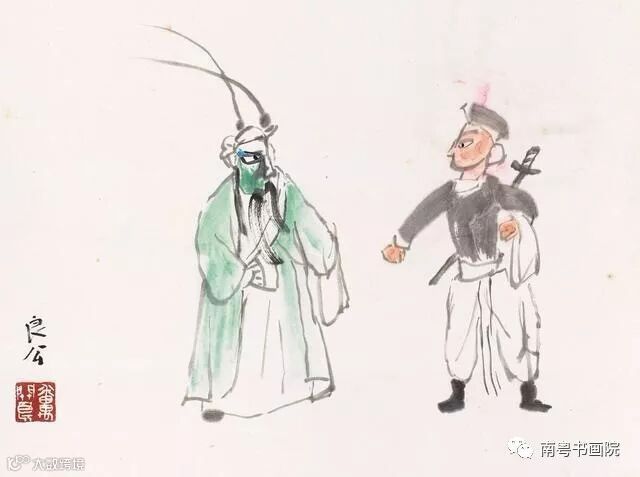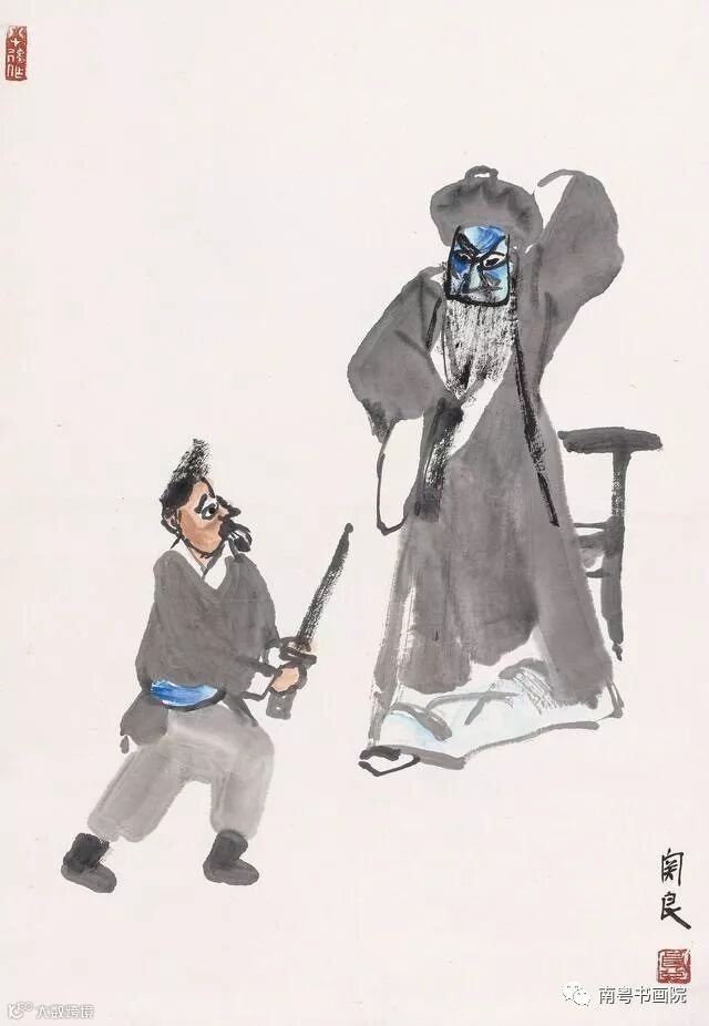 关良先生的戏剧人物画,从整体到局部都做到十分精意,但由于其天性的淡泊和超脱的气质,及把握娴熟的艺术行为,又使人感到不甚经意的轻松和幽默。这种从形式到笔墨内容的含蓄,又与关良先生一生恪守的谦逊自退的传统道德风范相一致,是近现代中国水墨人物画创新成功的典范。