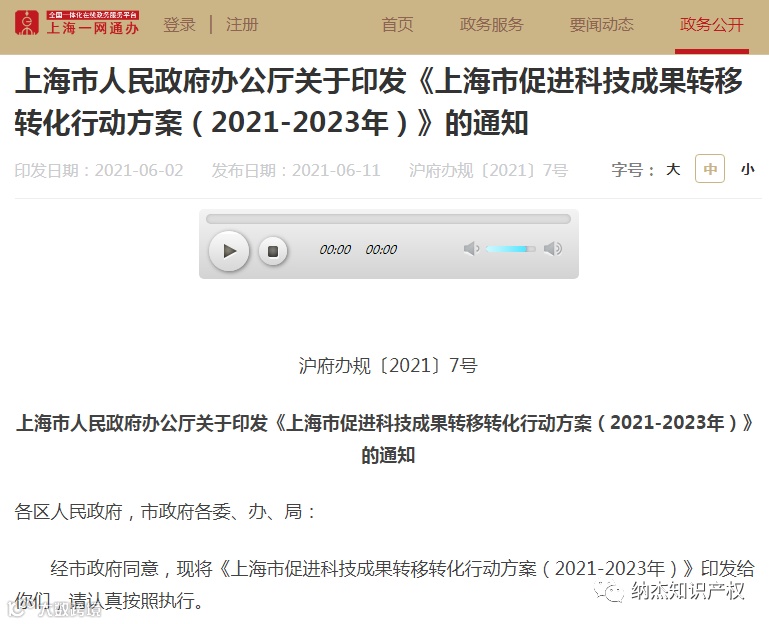 《上海市促进科技成果转移转化行动方案(2021-2023年)》将自2021年7月1日起实施。