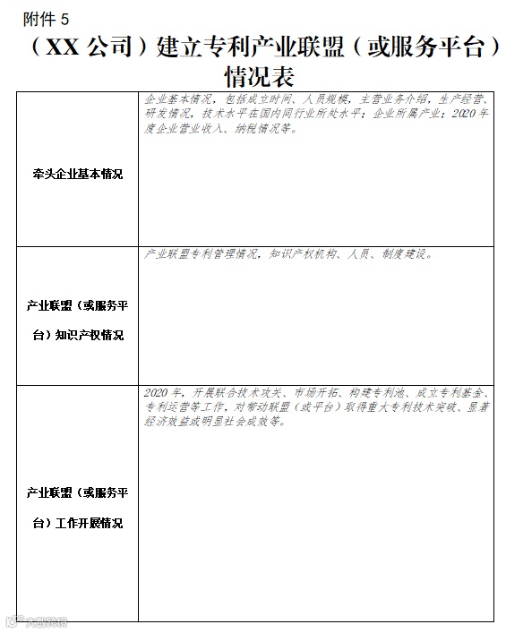 7.申报项目5的,还应提交《建立专利产业联盟(或服务平台)情况表》(见附件5)、工作报告并附相关证明材料。