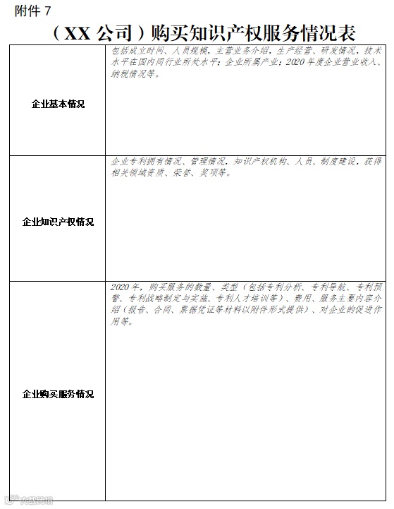 9.申报项目7的,还应提交《购买知识产权服务情况表》(见附件7)、工作报告并附购买知识产权服务费用(包括专利分析、专利导航、专利预警、专利战略制定与实施、专利人才培训等)凭证。