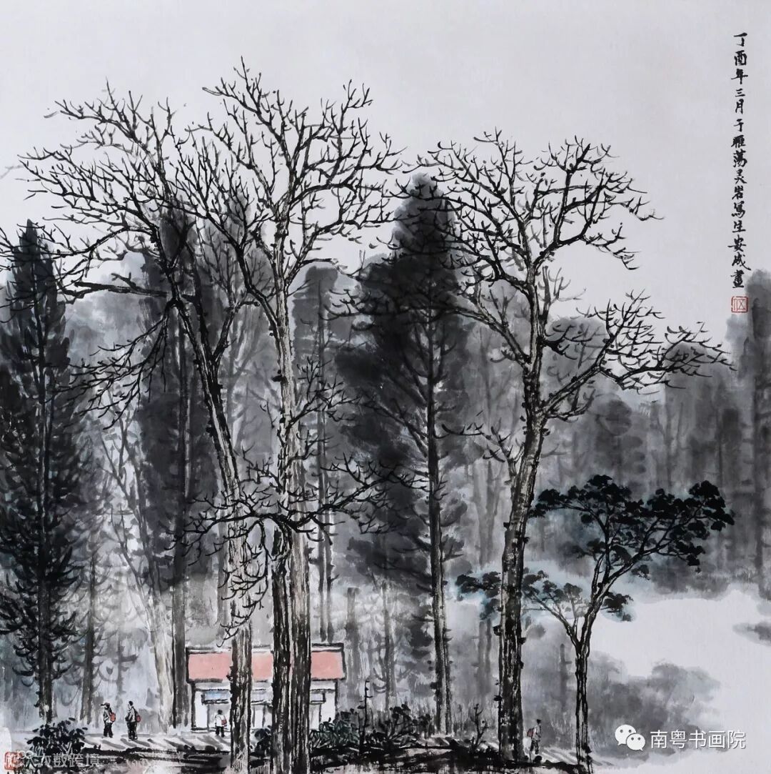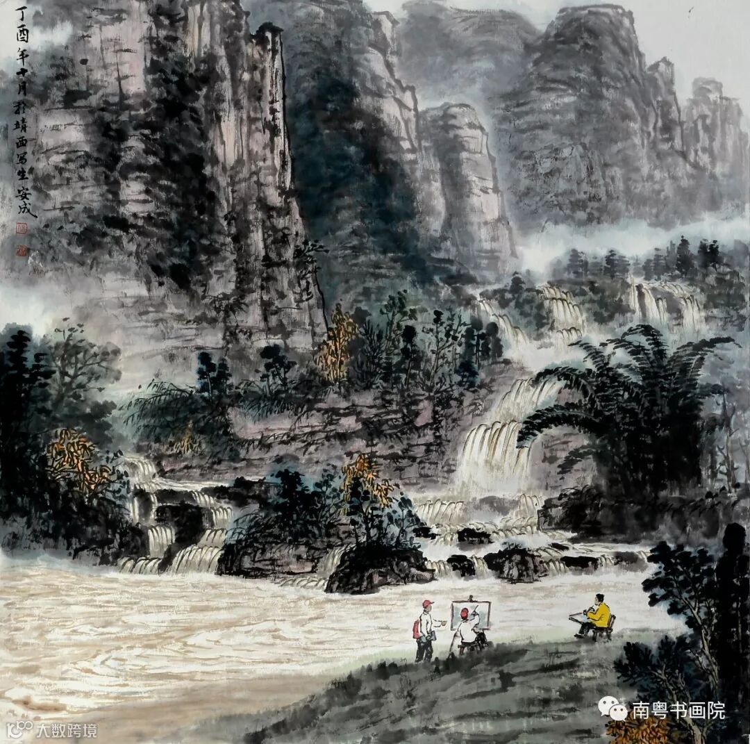 舍弟安成五十多岁始习画,十年如一日,刻苦勤奋,博览历代名家之作,研读经典,临习不断。他常说“临摹是学习古人的技法,并非复制。”石涛、石谿、弘仁、沈周、龚贤、王蒙、黄公望、倪云林、乃至近现代的大家作品,他都一一临习,领悟前人的精髓。注重师古人的同时,更重师造化,数年来,坚持外出写生,向大自然学习。他学古不泥古,把传统笔墨技法应用于写生之中,并从写生中发现属于自己的技法,把握对真山真水的组合、取舍和虚实的处理,把生活的真实变成艺术的真实;把寻常的风景变成有生命的有意境的画面。故,观其画作,浑厚多变,笔墨灵动,脱俗清新;无论巨构或小品,都能认真构思,反复琢磨,大胆落笔,细致中尽显气魄。