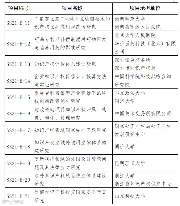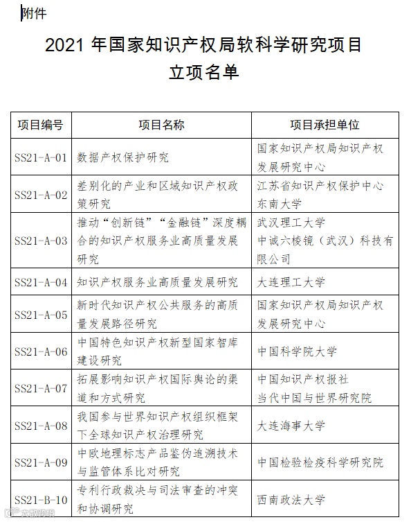 国家知识产权局办公室关于印发2021年度软科学研究项目立项名单的通知