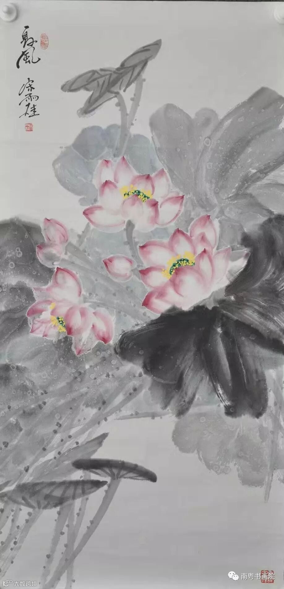 宋雨桂是一位天赋很高,悟性极强,才华横溢的书画家,有“鬼才仙气”之美誉。擅长山水、花卉、书法,尤以山水著称于世。其山水结构布局,精微大气,笔墨交融,干湿互施,连笔劲爽,用色淡雅。作品尤崇尚“气韵”,笔尖、肚、根截能连用自如,放笔运转千万变化。他曾创作过一幅水墨《槐露》,阔笔大墨、淋漓尽致,虽干犹湿,气势酣畅。可以说,中国画十八般武艺在《槐露》中得到了充分的展现,也显示了宋雨桂深厚的艺术功力和过人的才华。以笔者之见,这幅《槐露》完全可以跻身当今最经典的水墨之列。