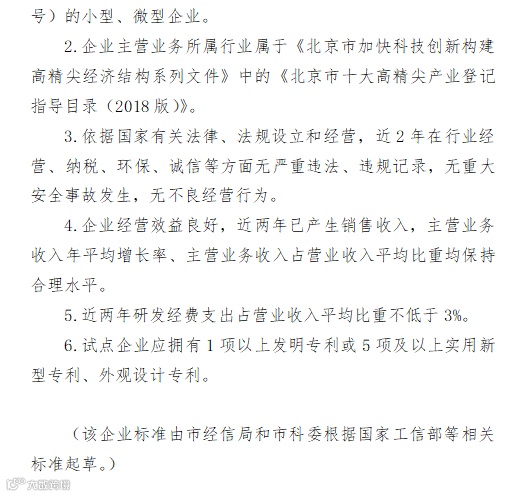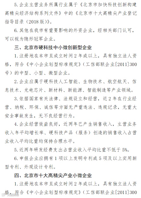 重点领域中小微企业包括硬科技中小微企业和十大高精尖产业小微企业,应符合《2021年北京市知识产权保险试点工作实施指南》相关要求,属于国家高新技术企业、中关村高新技术企业、北京市知识产权试点示范企业以及本市支持中小企业发展资金和基金支持的企业优先。