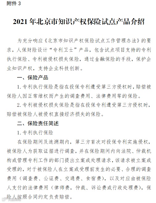 (一)试点保险公司。2021年,我局通过公开招标形式确定中国人民财产保险股份有限公司北京市分公司(“人保财险”)为本年度试点保险公司,对其保险产品进行备案,由其负责组织全市的知识产权保险试点投保工作。请符合条件的企业通过北京小微企业金融综合服务平台(https://www.smeservice.com/),积极开展专利执行险、专利被侵权损失险及其组合险的投保工作,由人保财险根据企业的投保情况组织评审,确定可以投保的公司和专利。我局将对人保财险承保的、符合《北京市知识产权保险试点工作管理办法》及其实施指南的企业购买保险的保费予以支持。