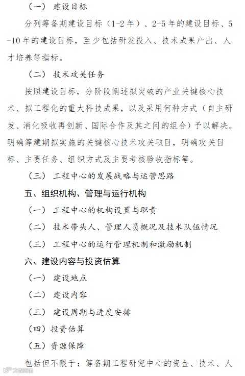 (二)申报单位应根据自身优势,本着实事求是原则,研究编制工程中心组建方案(双面打印)。工程中心在组建方案中应同步编写创新能力建设项目的资金申请报告(双面打印),项目总投资不少于3000万元,其中固定资产投资不低于50%,评审的建设内容主要包括研发场所、实验平台、测试环境等相关研发环境的建设和完善,购置必要的软硬件设备,进行与项目技术成果产出直接相关的系统开发等,不包含土建工程、人员工资奖金等相关建设内容。