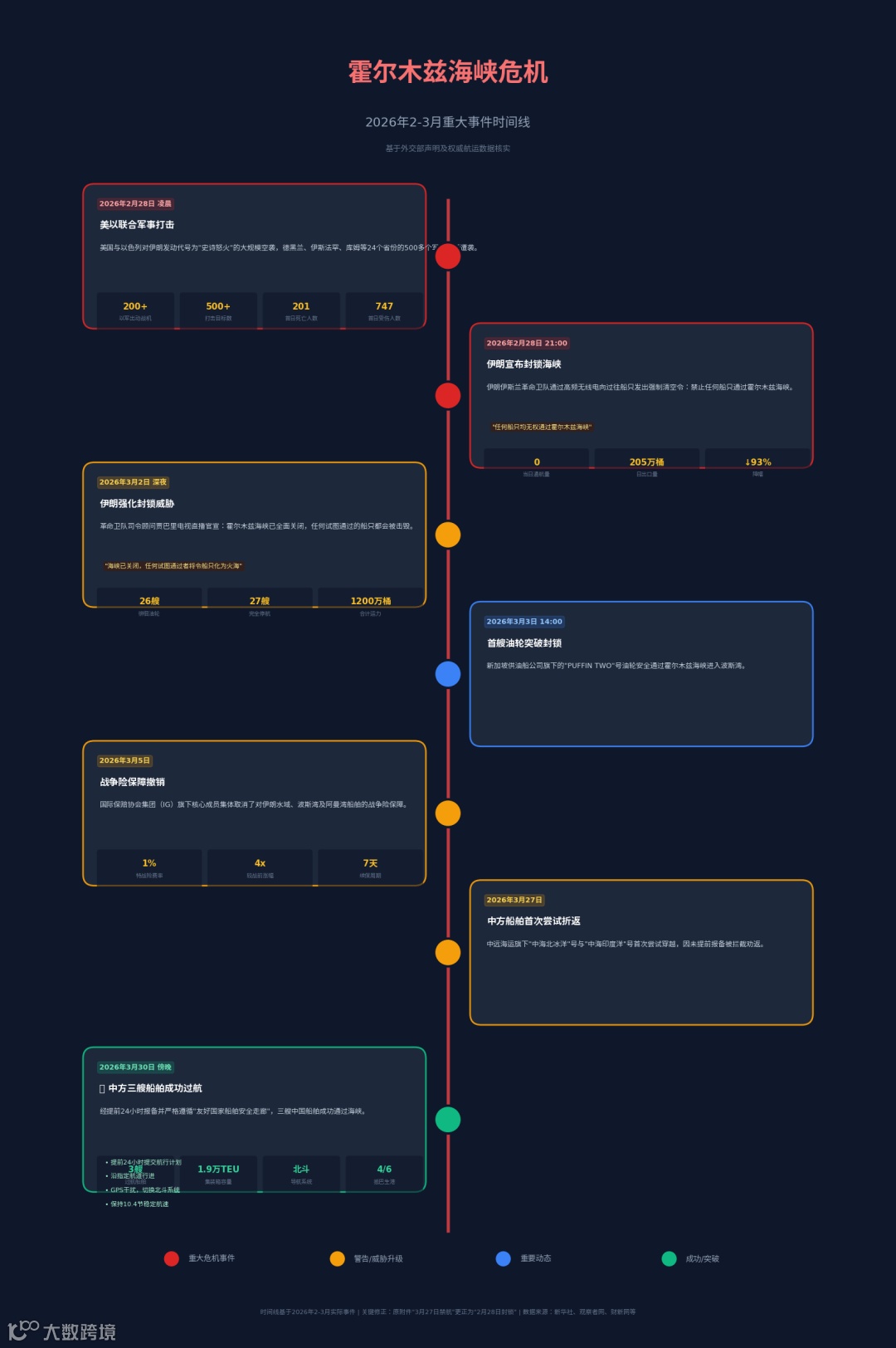 美以军事打击与伊朗封锁声明(2026年2月28日): 2026年2月28日凌晨,美国与以色列对伊朗发动大规模联合空袭,德黑兰、伊斯法罕、库姆同时遭袭。作为报复,伊朗伊斯兰革命卫队当晚宣布禁止任何船只通过霍尔木兹海峡。这一军事性封锁措施切断了全球约五分之一石油贸易和大量商业货物的核心海运通道,原本处于"高风险"状态的航运瞬间变为"硬阻断"。