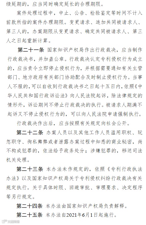 为贯彻落实党中央、国务院关于全面加强知识产权保护的决策部署,加大专利行政保护力度,根据修改后专利法的有关规定,国家知识产权局起草了《重大专利侵权纠纷行政裁决办法(征求意见稿)》,现向社会公开征求意见。有关单位和各界人士可于2021年4月2日前,通过以下方式提出修改完善意见: