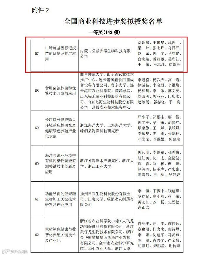 2022年12月23日,内蒙古必威安泰生物科技有限公司荣获“全国商业科技创新型企业”和“全国商业科技进步奖(一等奖)” 两项殊荣。此荣誉是中国商业联合会以及各级政府对内蒙古必威安泰生物科技有限公司口蹄疫基因标记疫苗的研制成果和科技创新能力的认可,更是对该产品推广前景及助力我国口蹄疫无疫区建设的肯定和激励。目前内蒙古必威安泰生物科技有限公司已与宁夏、四川、甘肃、河北等建立了口蹄疫无疫区建设工作合作事宜,此工作的开展满足我国口蹄疫净化需求,发挥其应有的社会经济效益,为广大养殖户养殖过程的生物安全保驾护航。