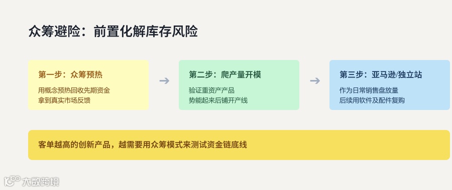 这是一种典型的DTC(直营)避险打法。用众筹的钱去验证重资产产品;等口碑和势能起来后,再切入亚马逊做日常销售盘,最后独立站承接私域复购(配件、课程等)。 在这套叙事里,库存周转的风险被前置化解了。