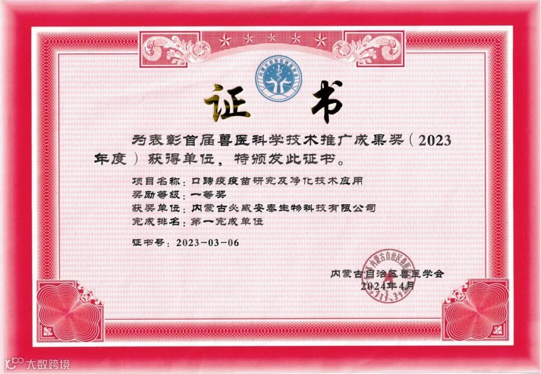 近日,内蒙古自治区兽医学会关于首届兽医科学技术奖(2023年度)揭晓。内蒙古必威安泰生物科技有限公司的“口蹄疫疫苗研究及净化技术应用”项目,荣获2023年度首届内蒙古自治区兽医学会科学技术推广成果奖一等奖。