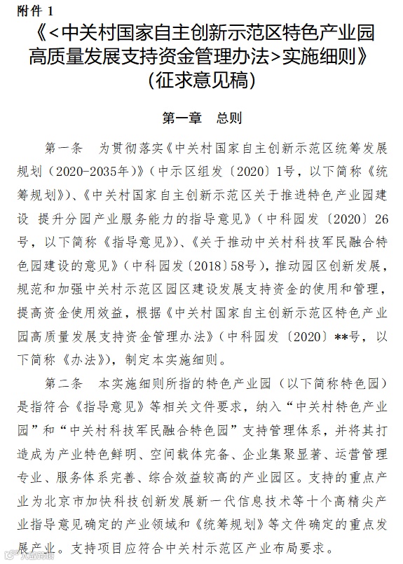 附件:1.《<中关村国家自主创新示范区特色产业园高质量发展支持资金管理办法>实施细则》(征求意见稿)