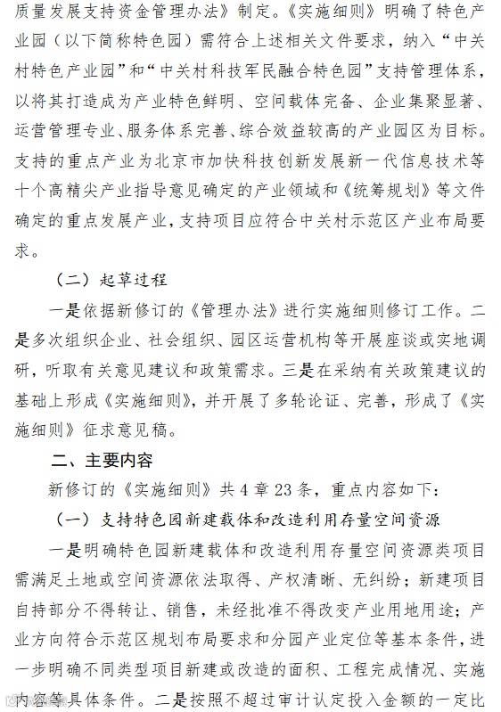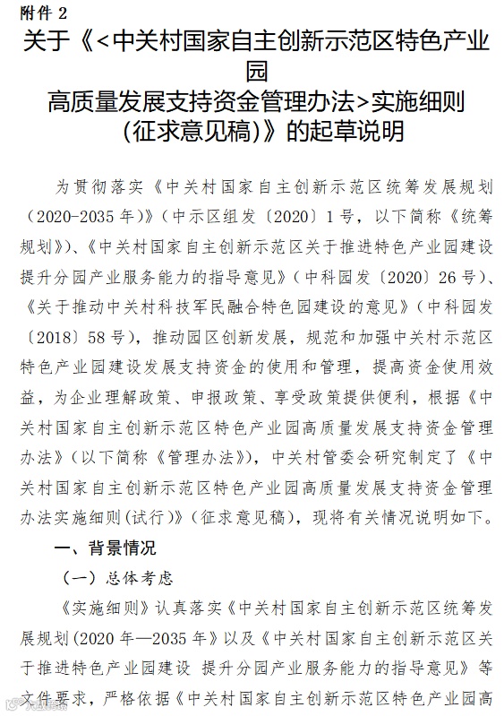 2.关于《<中关村国家自主创新示范区特色产业园高质量发展支持资金管理办法>实施细则》(征求意见稿)的起草说明