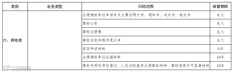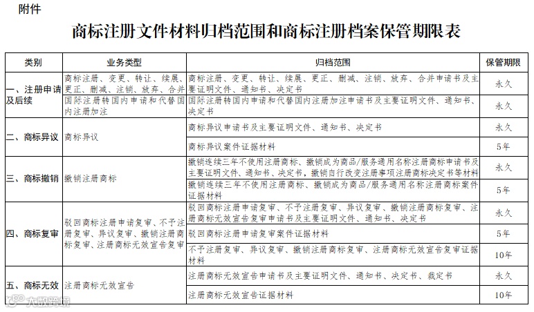 第十条 商标注册档案的保管期限分为永久和定期两种,具体按照本办法附件《商标注册文件材料归档范围和商标注册档案保管期限表》执行。