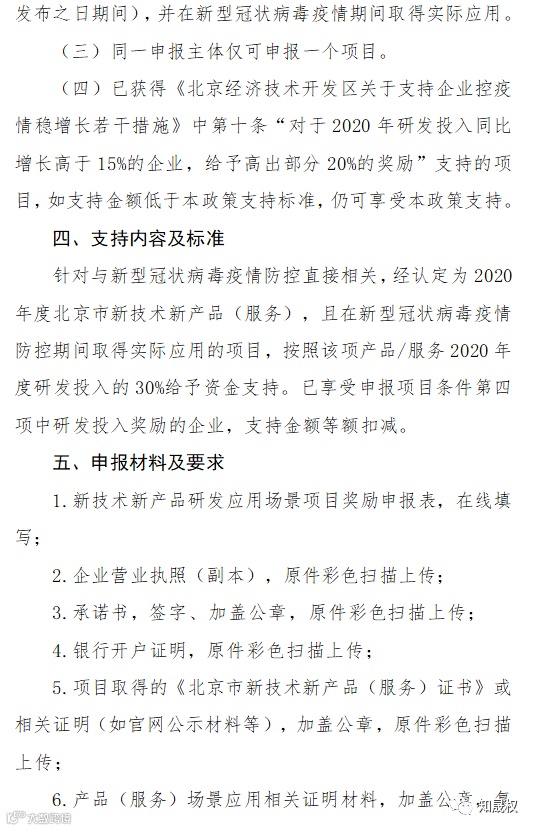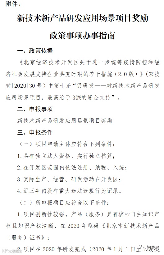 为贯彻落实《北京经济技术开发区关于进一步统筹疫情防控和经济社会发展支持企业共克时艰的若干措施(2.0版)》(京技管[2020]30号)的工作要求,现开展新技术新产品研发应用场景项目奖励申报工作,通知如下: