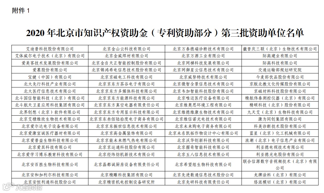 根据《北京市知识产权资助金管理办法(试行)》(京知局〔2019〕324号)、《关于申报2020年北京市知识产权资助金(专利资助部分)的通知》(京知局〔2020〕45号)和《关于申报2020年北京市知识产权资助金(商标、地理标志、知识产权使用费出口资助部分)的通知》(京知局〔2020〕124号)的有关规定,现将符合资助条件的2020年北京市知识产权资助金第三批专利资助单位和商标资助单位名单分别予以公示,公示期自2020年8月19日起至8月25日止。