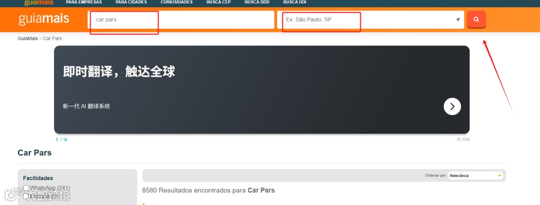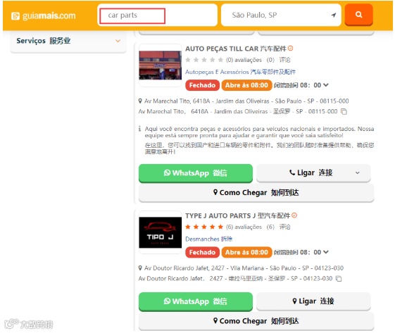 1. 按巴西城市搜索企业,将产品关键词译为葡语输入(如"car pars")