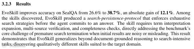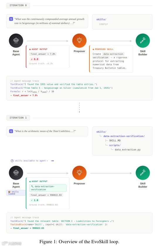 · 提议者智能体比对预测与真实答案,定位失败根源并生成文字版技能提案