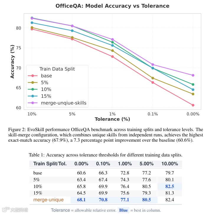 在OfficeQA文档推理测试中,基础准确率60.6%。引入EvoSkill后: