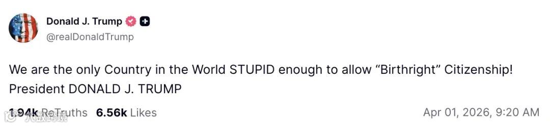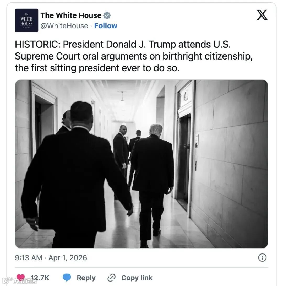 辩论期间特朗普听取约90分钟即离场,全程遭遇大法官方严峻质疑。庭审后其在社交媒体声称美国“愚蠢地”承认出生公民权,重申2025年1月签发的行政令核心:非法移民及临时签证者子女将不再自动获得国籍。