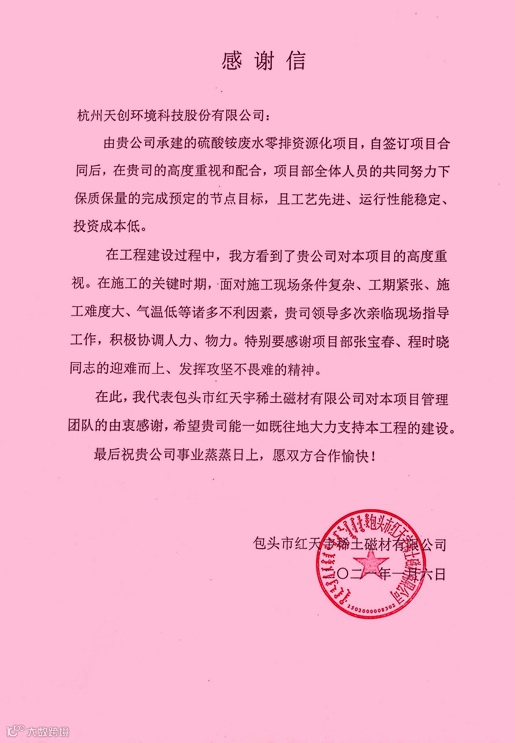 包头市红天宇稀土磁材有限公司是一家以稀土精矿为原料生产混合碳酸稀土的企业,是杭州天创环境科技股份有限公司(以下简称“天创环境”)的老客户。时隔4年,因其业务扩展,需新增硫酸铵废水零排资源化项目。出于对天创环境的信任和较紧张的工期的需要,客户再次选择天创环境作为项目承包方。天创环境不负使命,利用专业优势集中行业资源,及时有效地满足了客户的需求,解决了客户的燃眉之急。