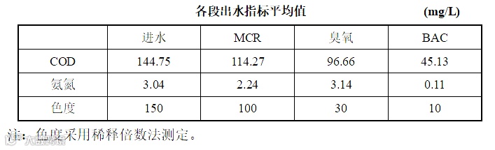 该工艺用于某精细化工园区污水处理厂提标,由《城镇污水处理厂污染物排放标准》(GB18918-2002)三级标准提标至一级A标准,废水主要超标的指标为COD、色度。经过该工艺处理后的水质如下: