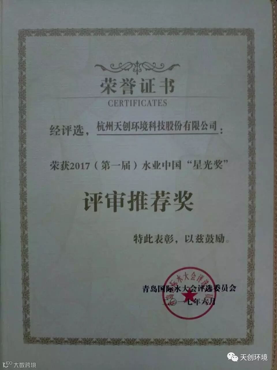 天创环境在本次大会的亮点,荣获2017(第一届)水业中心“星光奖”评审推荐奖的荣誉大奖,这是中国水业对天创环境的又一次肯定,将天创环境在解决水资源环境的贡献推向了全国乃至全世界。